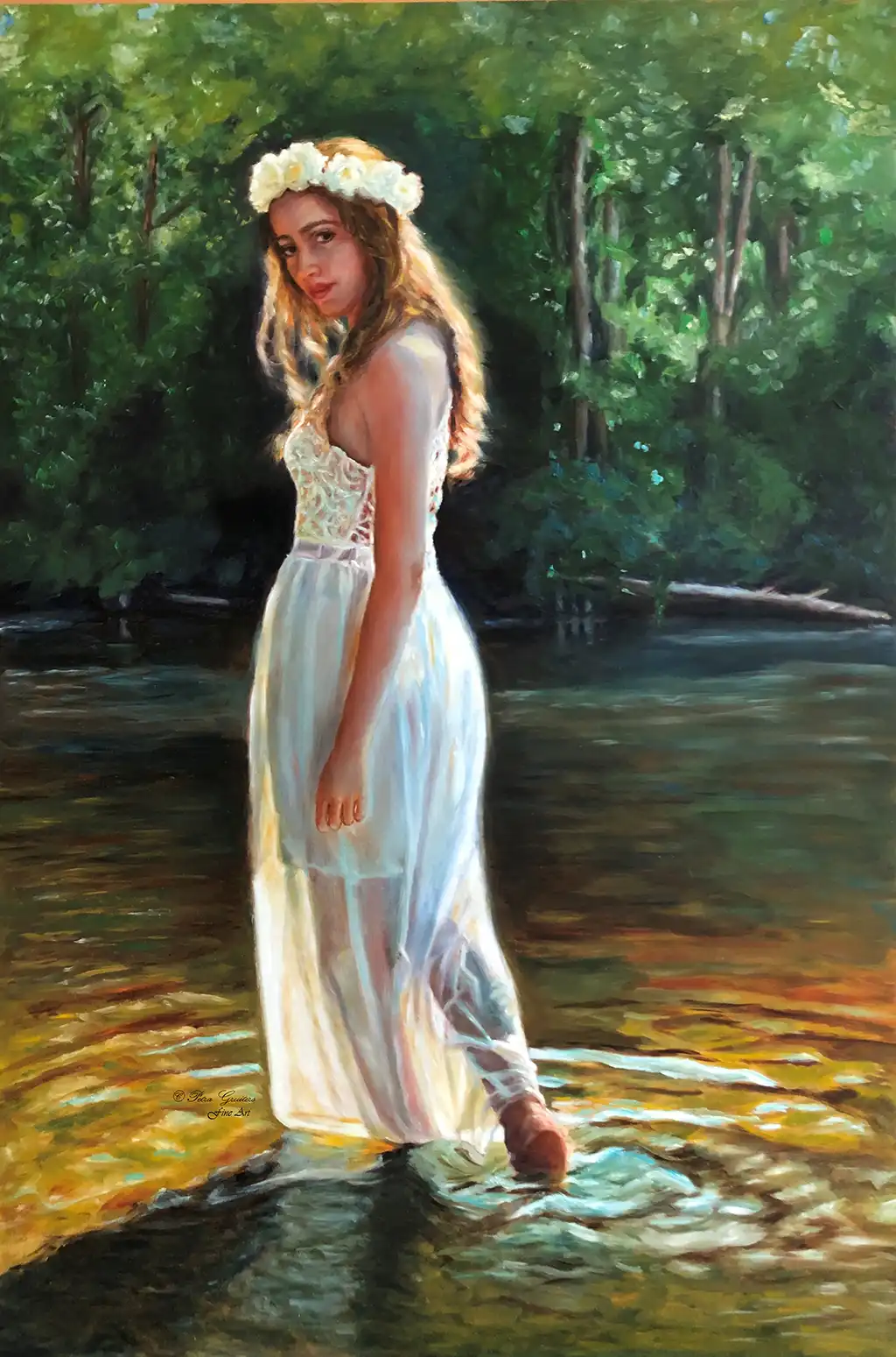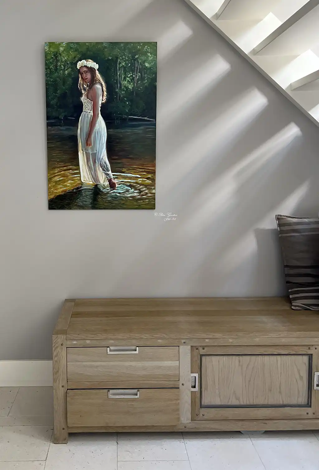 Gruiters' painterly technique, with its focus on intricate details and soft brushstrokes, brings the woman’s expression and posture to life, embodying a quiet yet powerful emotional depth. Executed in oil on a wooden panel, the piece measures 90 x 60 cm, making it an ideal choice for intimate spaces like a bedroom or lounge, where its contemplative atmosphere can be appreciated. Gruiters’ work is rooted in Expressionism, with a figurative approach that blends realism with a dreamlike quality, allowing viewers to immerse themselves in the subject's world. The forested background and reflective water suggest an otherworldly environment, positioning the woman in an ethereal setting that enhances her solitude and beauty. This blend of fantasy and femininity resonates with Gruiters' artistic vision, which often explores the strength and vulnerability of women. Inspired by romance, nature, and fashion, her art invites viewers to experience a quiet moment of reflection.