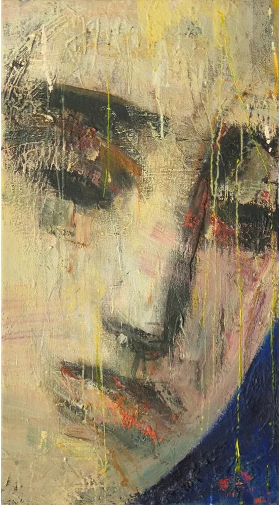 This 90x51 cm oil on canvas painting features a fragmented, introspective face emerging from layers of muted earthy tones, deep blues, and subtle hints of red and yellow. The expressive black strokes define the facial features, enhancing the dreamlike, contemplative quality of the piece.