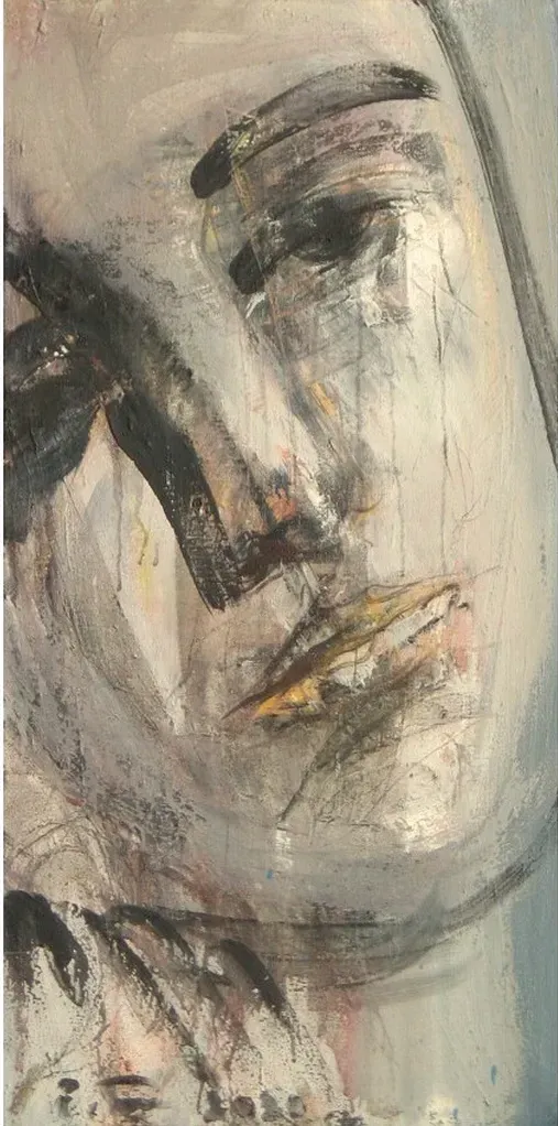 This 80x40 cm oil on canvas painting presents a melancholic yet serene face, emerging through layers of soft grays, muted earthy tones, and delicate hints of warm ochre. Bold black strokes add contrast and intensity, emphasizing the subject’s introspective and dreamlike expression.
