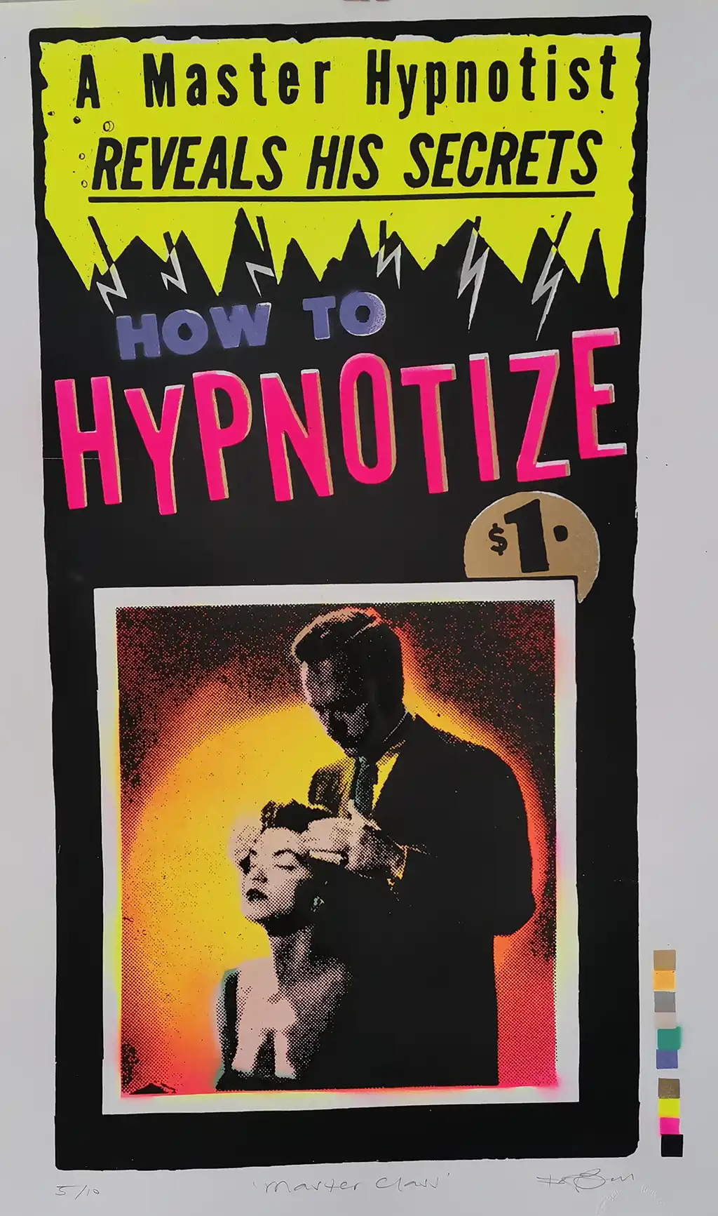 The text, reminiscent of old carnival signs, reads "A Master Hypnotist Reveals His Secrets – How to Hypnotize," while the figure of the hypnotist in action adds a sense of mystery and intrigue to the work. This circus-inspired piece brings a sense of retro amusement and theatricality, perfect for those who enjoy playful, vintage aesthetics. Each print is individually hand-stenciled, blindstamped, and backed on cardboard, ensuring that each piece is unique. Dylan Bell’s Master Class blends the nostalgia of vintage circus posters with modern pop art techniques, making it an eye-catching addition to any living room, office, or gallery space. Its bold colors and entertaining subject matter are sure to capture attention and spark conversation.