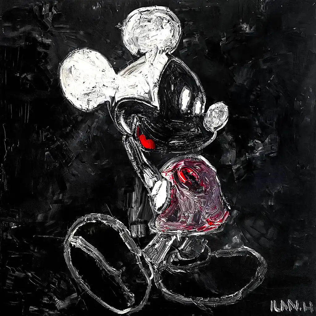 Crafted with oil on canvas, the artwork showcases Halfon’s unique approach to texture and form, utilizing thick layers of paint to create a tactile, almost sculptural quality. The piece is a stark contrast between the playful innocence typically associated with Mickey Mouse and the darker, more complex emotions conveyed through the artist's expressionist style. This juxtaposition invites viewers to reflect on the duality of childhood nostalgia and the often-overlooked undertones of commercialized icons. "Me He Him" would be a compelling addition to any contemporary space, serving as both a conversation piece and a visual anchor in environments such as living rooms, modern offices, or art galleries. Its bold presence and emotional depth make it perfect for those who appreciate art that challenges the conventional and offers a fresh perspective on familiar imagery.