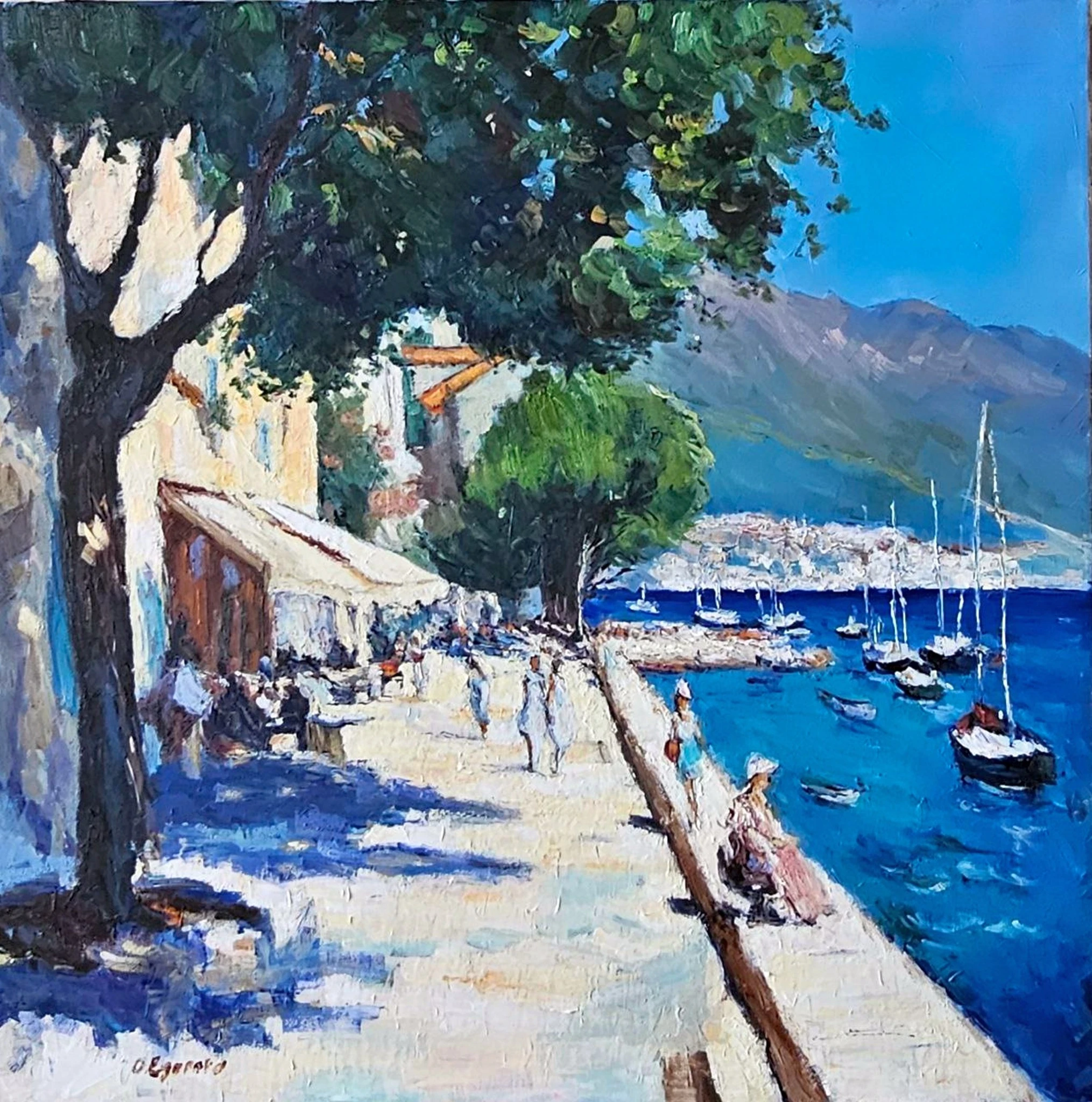 “Mediterranean Idyll” by Olga Egorov captures the timeless beauty of a sun-drenched promenade along a sparkling bay. This 50x60 cm oil painting invites you to wander beneath leafy trees and past bustling cafés as you take in a view of distant mountains and moored sailboats. Rendered in an Impressionist style, the scene glows with bright Mediterranean light, dappled shadows, and lively brushwork. Whether seated on the seawall or strolling with purpose, the people become part of the landscape—united by serenity and warmth. Olga Egorov’s vibrant palette and masterful textures convey a deep love for the beauty of coastal life. This piece transforms any space into a vacation escape—ideal for a living room, dining area, or refined hospitality setting.