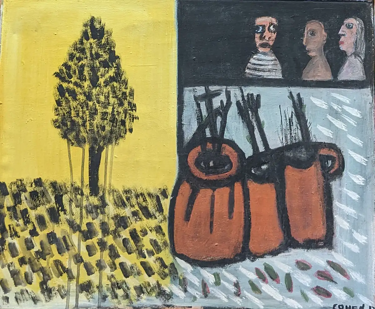 "Melancholic Muse" by Mordechai Cohen is a painting rich in narrative and contrast. On one side, a solitary tree stands vibrant against a yellow field, symbolizing life and growth. Adjacent, a somber scene unfolds with three figures and a collection of vases, perhaps conveying the complexity of human emotions and relationships. The palette is a mix of warm yellows and earthy tones against cooler, muted backgrounds, providing a visual juxtaposition that mirrors the thematic one. The lighting across the different elements varies from the luminescence of the tree to the flat, subdued portrayal of the figures and objects, suggesting a metaphor for the light and shade in life. This painting could resonate in a space for reflection, such as a study or a quiet corner of a living room, inviting viewers to ponder the layered meanings.