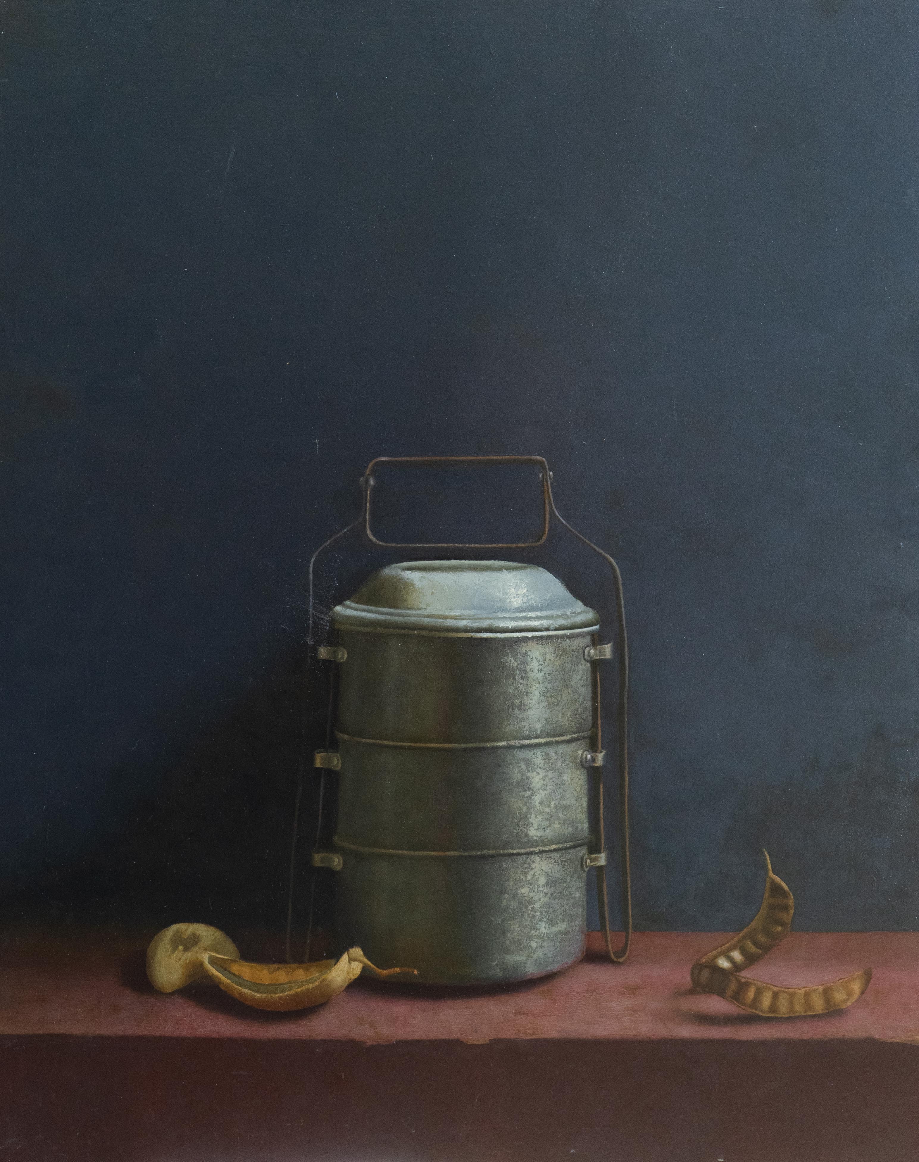 Menschke by Micha Set presents a captivating hyper-realistic still life, combining the metallic sheen of a vintage tiffin box with organic pod forms.