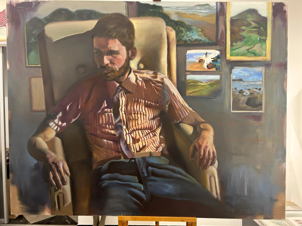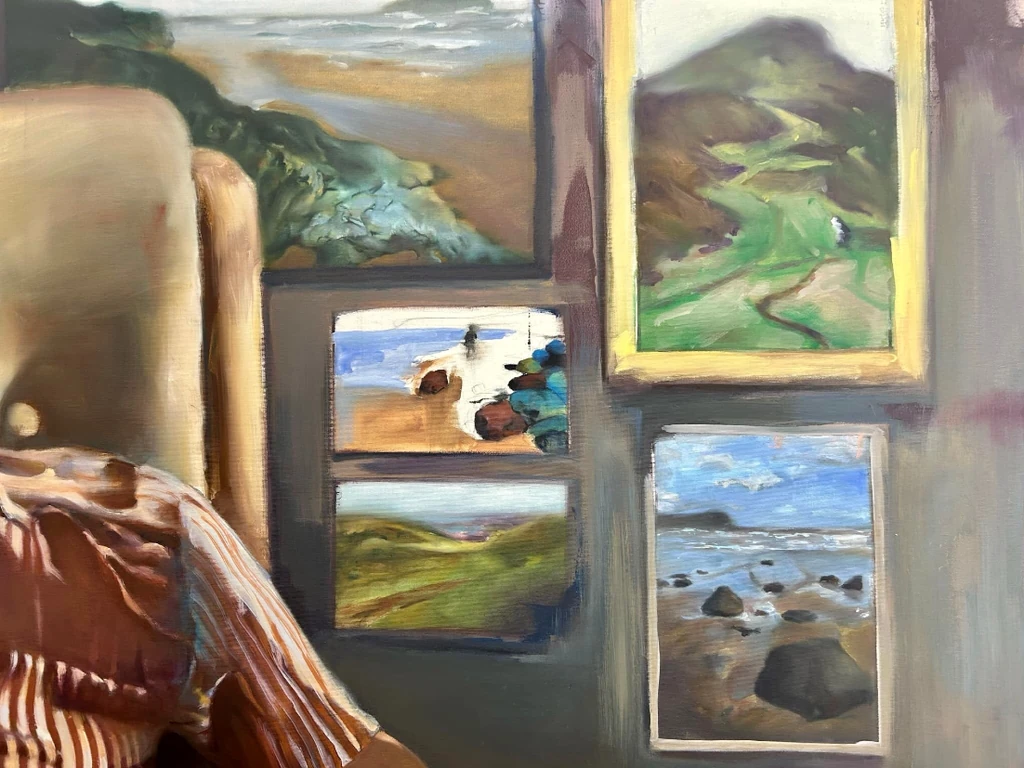 Framed by interior walls and several small landscape paintings, the subject sits surrounded by imagined escapes. The contrast between the cozy, enclosed space and the window-like vistas of rolling hills and sea shores suggests a longing to wander—mentally or otherwise. HEGEDŰS blends figurative realism with subtle expressionism, emphasizing posture, gaze, and light to evoke an atmosphere of calm melancholy.