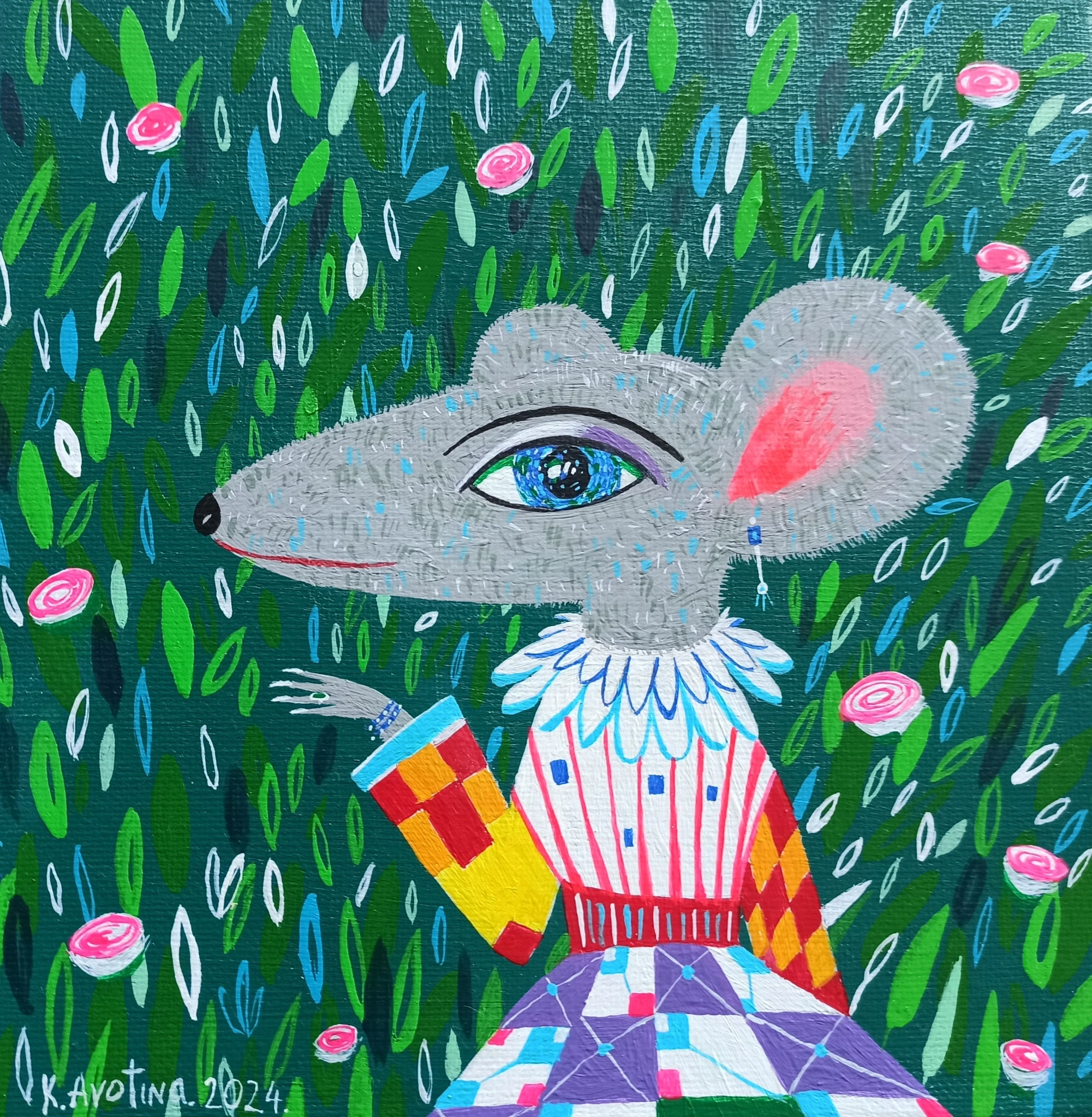 “Miley” by Katrina Avotina is a whimsical portrait of a mouse painted in joyful color and pattern. The character’s expressive eye, playful clothing, and forest backdrop create a fantasy moment full of charm and imagination. Rendered in acrylic on a 20×20×2 cm canvas, this piece is ideal for children’s rooms, kitchens, or reception areas that welcome color and creativity. A joyful and uplifting work of naïve art.