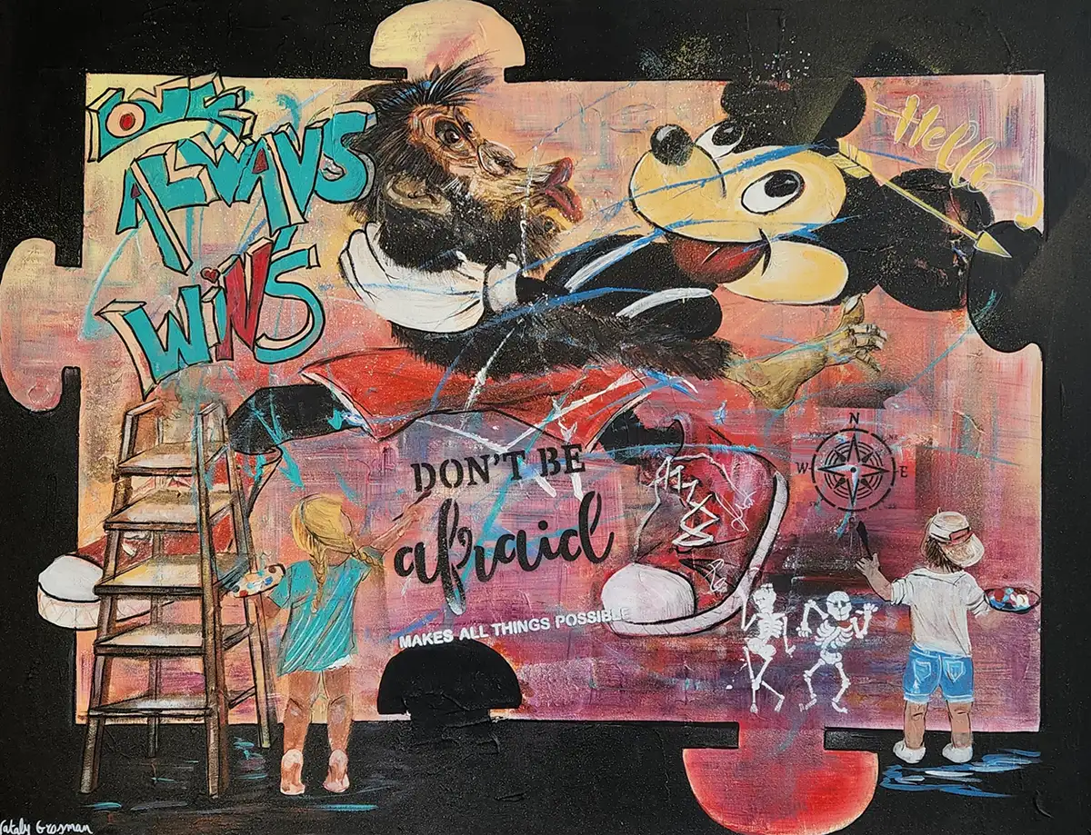Miss You layers pop culture with surrealism, showcasing a whimsical assembly of familiar characters and graffiti elements.