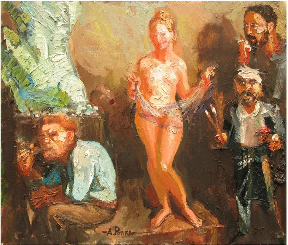 The composition revolves around a central nude figure, delicately poised with a cloth, surrounded by intriguing onlookers. Repka’s textured brushwork and rich color palette—dominated by warm earth tones, deep browns, and striking hints of blue and red—bring the scene to life with depth and emotion.