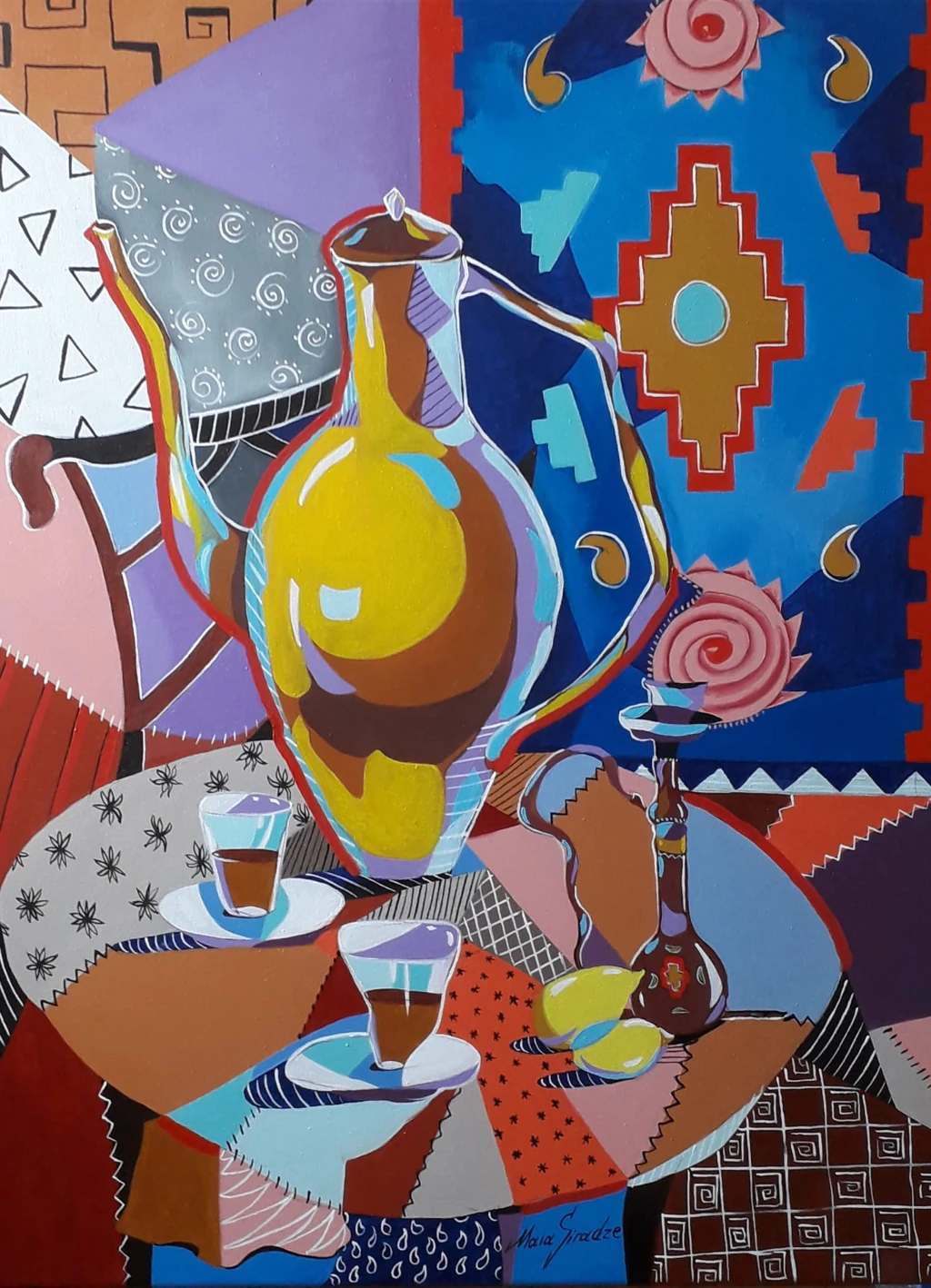 Explore Maia Siradze’s Moroccan Tea—a vibrant 2024 cubist oil painting celebrating Moroccan tradition, warmth, and cultural elegance.