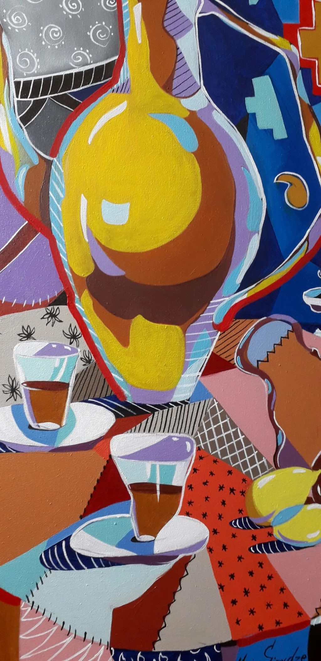 Measuring 80 cm by 60 cm, this oil on canvas piece blends the elegance of a Moroccan tea set with the dynamic geometry of cubism. With warm tones of yellow, blue, and red, the composition radiates a cozy and inviting atmosphere.