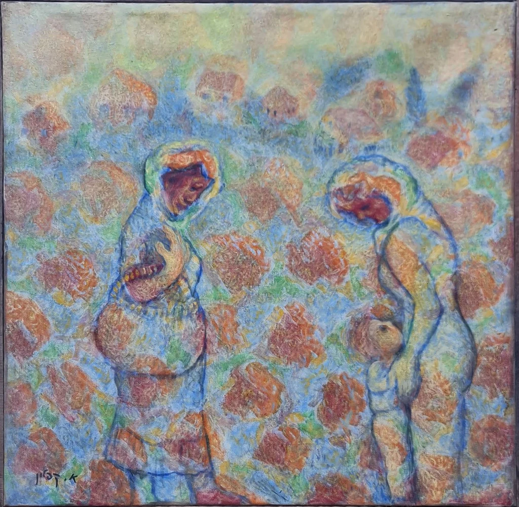 Created in Post-Impressionist style, this artwork radiates warmth and devotion through Kaplan’s signature mosaic-like brushstrokes and harmonious color palette. The delicate outlines of the figures blend seamlessly into a textured background of soft blues, warm oranges, and gentle greens, enhancing the dreamlike atmosphere.