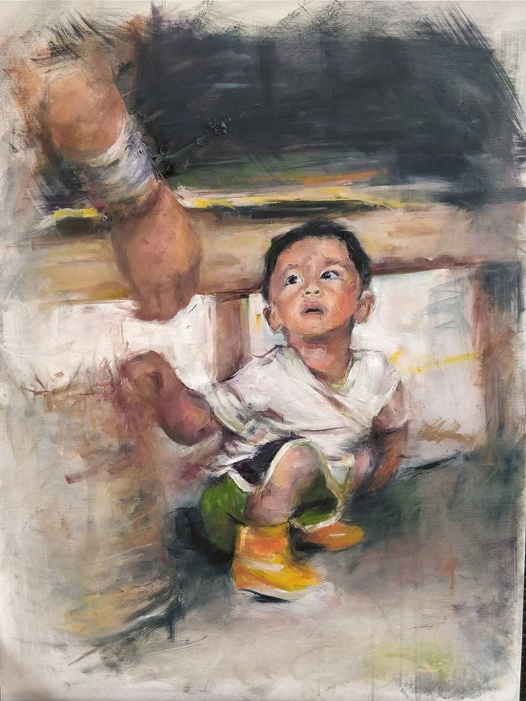 This 80 × 60 cm figurative work explores the emotional depth of maternal love, using soft yet expressive brushstrokes to depict an intimate moment of connection.