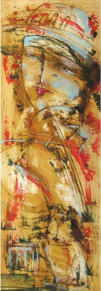 This oil-on-paper artwork (100 x 35 cm) features a harmonious blend of warm golds, earthy browns, fiery reds, and cool blues, creating a rich, textured composition. The abstract figure, delicately emerging from the background, suggests a musician lost in their craft, embodying passion and nostalgia.