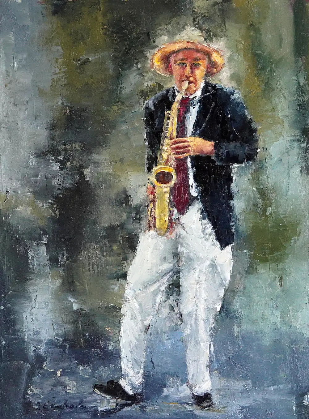 In this expressive artwork, Olga Egorov delves into the world of music through the medium of oil paint. The musician, adorned in a straw hat and classic ensemble, is intimately engaged with his saxophone, as if the melody flows directly from his soul. The textured backdrop and muted colors suggest a setting that's both timeless and atmospheric, possibly a jazz club or a street corner where music breathes life into the surroundings. This piece is perfect for adding character and inspiration to a music room, studio, or any space where creativity is cherished.
