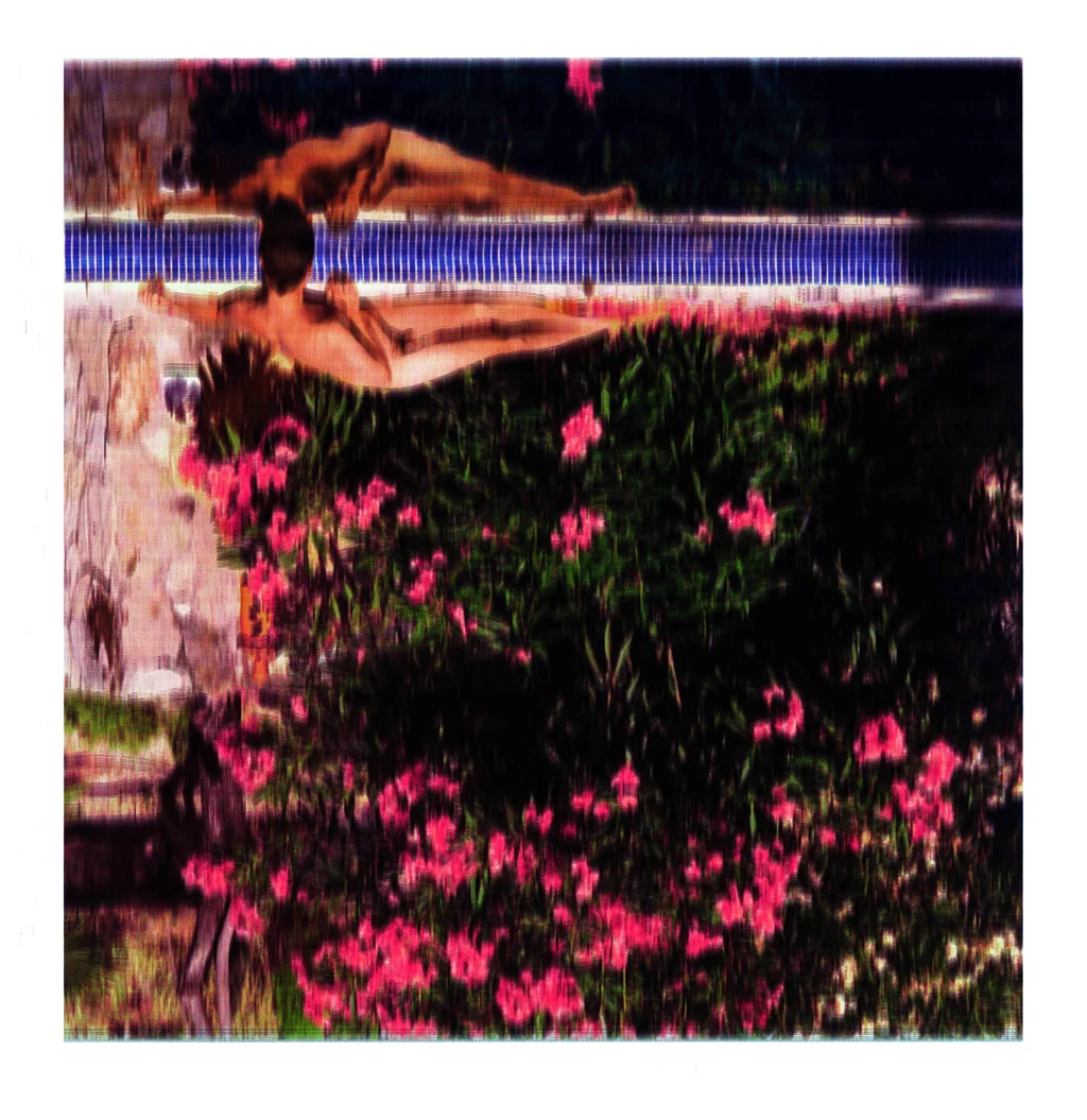 Crafted using a mix technique on traditional mould-made watercolor paper, this artwork features vibrant hues of pink florals, lush greens, and a serene blue reflecting pool. The delicate interplay of nature and human form creates a dreamlike quality that invites viewers into a contemplative space.