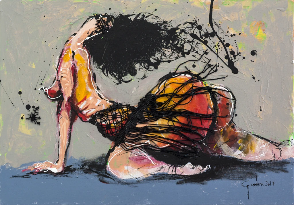 Measuring 35 cm by 50 cm, this captivating artwork showcases a fluid human form in an intense and expressive pose. The warm tones of red, orange, and yellow dominate the composition, symbolizing passion and vitality, while a neutral grey background provides a calm contrast that amplifies the dramatic gestures of the figure. Black accents, including the intricate use of threads, add texture and depth, enhancing the painting's evocative quality. The figure’s dynamic pose exudes sensuality and energy, creating a visual narrative that is both playful and powerful. Perfect for gallery displays or modern living spaces, "Nectarine" brings bold artistry and emotion into any setting. It is particularly suited for creative studios or contemporary interiors seeking a statement piece that celebrates human movement and expression. This artwork invites viewers to engage with its layers of texture, color, and gesture, making it an unforgettable visual experience.