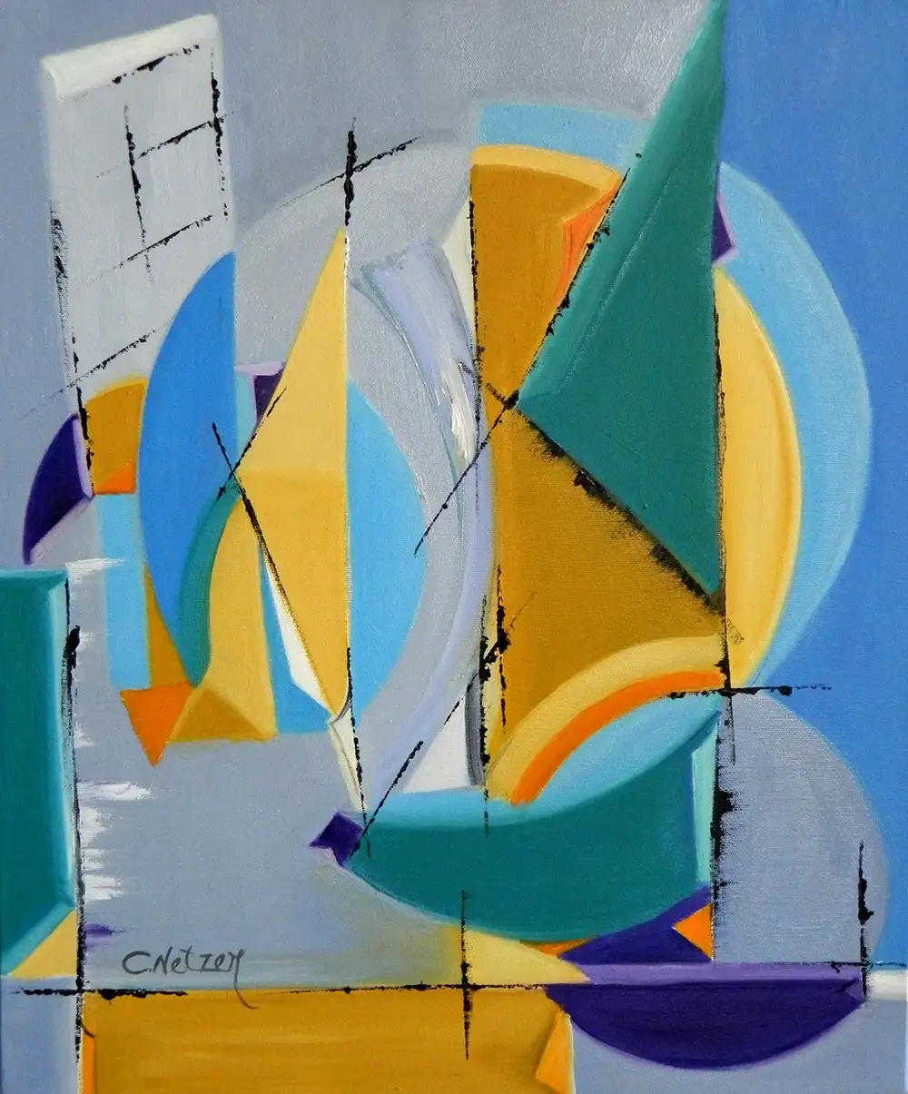 Clari Netzer's "New Beginnings" is a striking abstract painting that marries the spontaneity of freeform shapes with the precision of geometry. Born from the duality of mind and matter, the piece features a lively palette of cool blues, warm yellows, and invigorating oranges that seem to leap off the canvas. This painting illustrates Netzer's Mexican roots and her fascination with Primitive Art through the harmonious yet dynamic balance of colors and forms. The presence of both orderly and random elements in the work—such as precise lines, folded shapes, and wave patterns—speaks to the themes of freedom and the inherent dualities of life. Sized at 60x50 cm, "New Beginnings" is well-suited to a variety of spaces, including modern offices or living rooms, where its energetic vibe can inspire creativity and conversation.