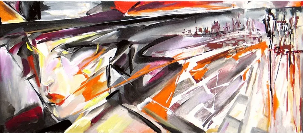 Rendered in oil on canvas, Gepp employs bold brushstrokes, vibrant warm tones, and deep contrasting blacks, giving the painting a sense of intrigue and motion. The subject’s gaze is both intense and enigmatic, seamlessly merging with the fluid strokes of the nighttime cityscape, symbolizing the connection between identity and place. The interplay of soft whites, fiery oranges, and moody grays adds to the painting’s ethereal quality, making it feel alive with urban energy.