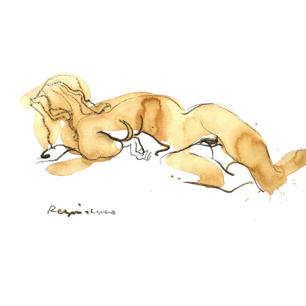 The reclining female figure is depicted with fluid strokes of warm beige and soft brown, bringing depth and intimacy to the composition.