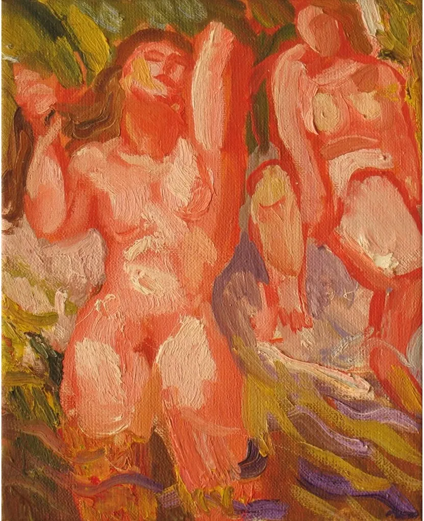 Repka’s technique blends Fauvist energy with expressionist intensity, making the figures appear both abstract and vividly alive. The nudes, immersed in their environment, exude an air of spontaneity and liberation. The interplay of colors and textures suggests a scene of vitality and connection to nature, inviting the viewer into an intimate moment of joy and self-expression.