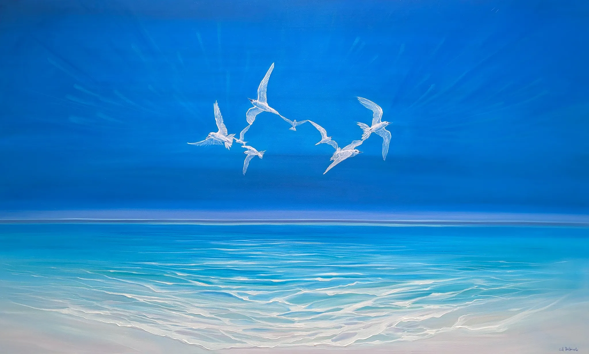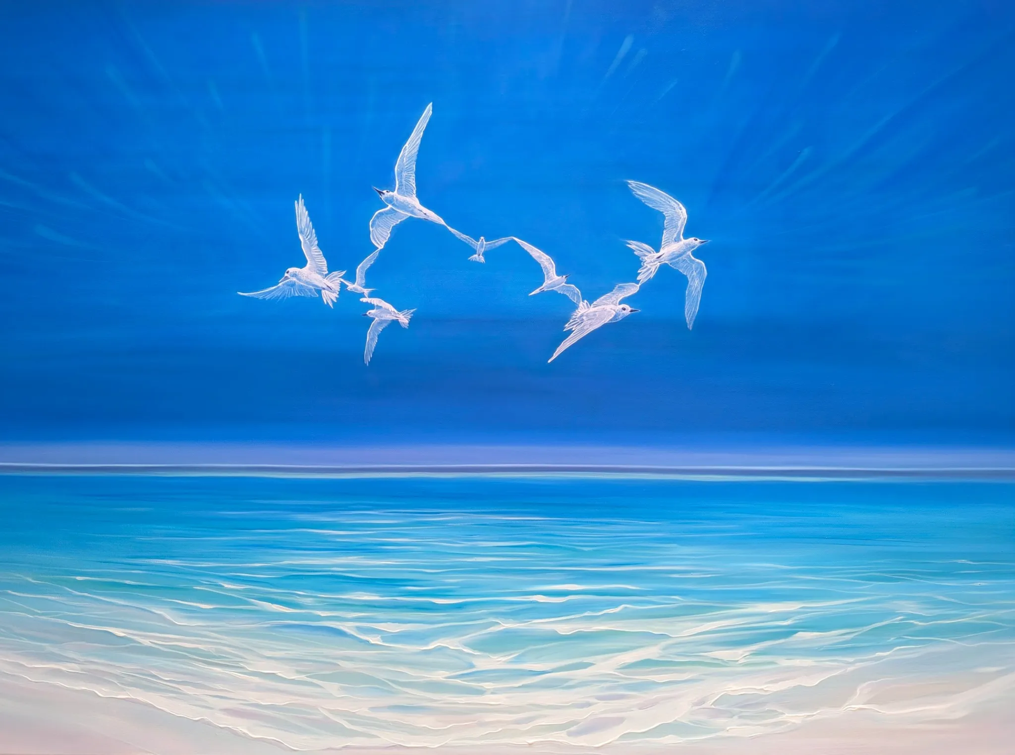 Ocean Magicians is a tranquil marine oil painting by Gill Bustamante that celebrates the grace of seabirds dancing above crystalline waters. Set against a vast, cool-toned seascape, the birds form an aerial ballet, capturing a moment of freedom and natural wonder. The painting’s gentle tones and flowing forms evoke a deep sense of calm and awe. At 60×36 inches, this piece makes an elegant statement in living rooms, offices, or reception areas.