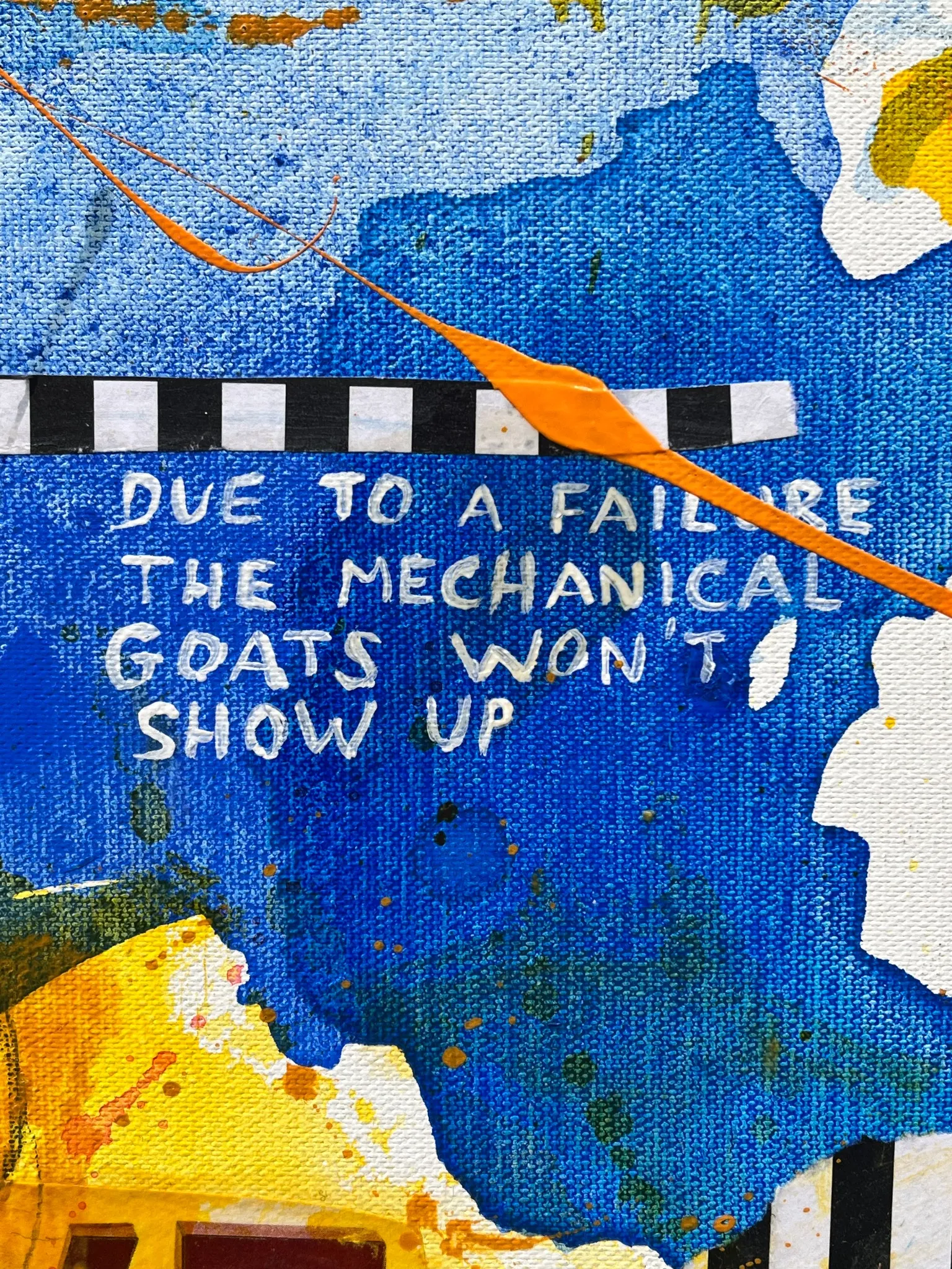 A striking grayscale portrait is framed by pearls, scribbles, and colorful shapes, accompanied by phrases like “LOVE” and “DUE TO A FAILURE THE MECHANICAL GOATS WON’T SHOW UP”—a signature Burgaz blend of wit and visual storytelling.