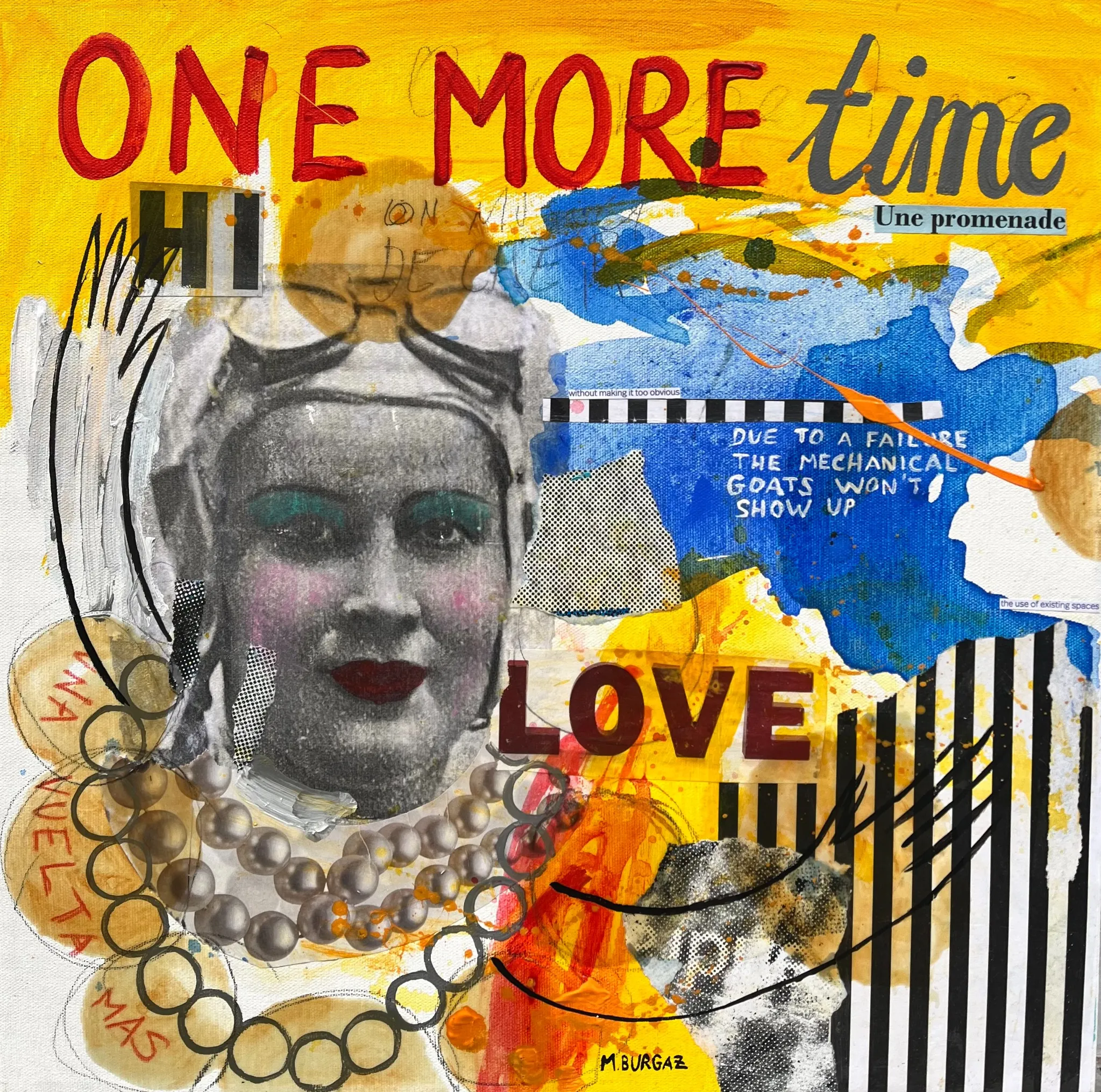 One more time by María Burgaz is a 40 x 40 cm mixed media artwork that bursts with color, layered imagery, and playful text.