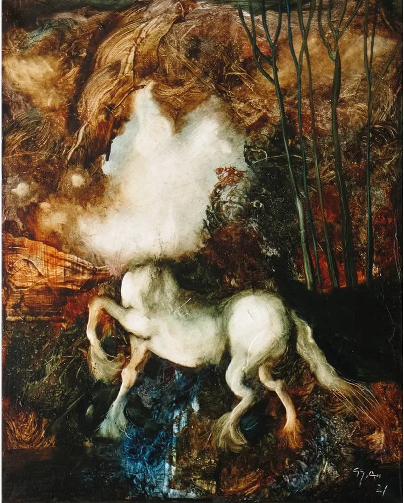 The deep earthy browns, fiery reds, and enigmatic blues set a dramatic tone, evoking a sense of nostalgia and mystery. The horse, symbolizing power and endurance, seems to materialize from the mist—an ethereal representation of the past merging with the present. The intricate detailing and layered textures create a mesmerizing, almost three-dimensional effect, drawing the viewer deeper into the story woven within the painting.