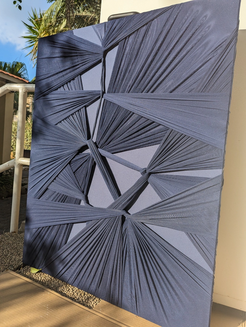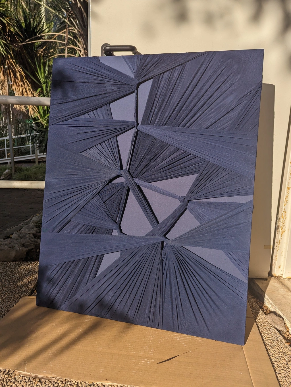Measuring 100 x 80 cm and crafted in 2024 this monochromatic artwork features deep navy tones and stretched fabric that create a sense of movement and strength.