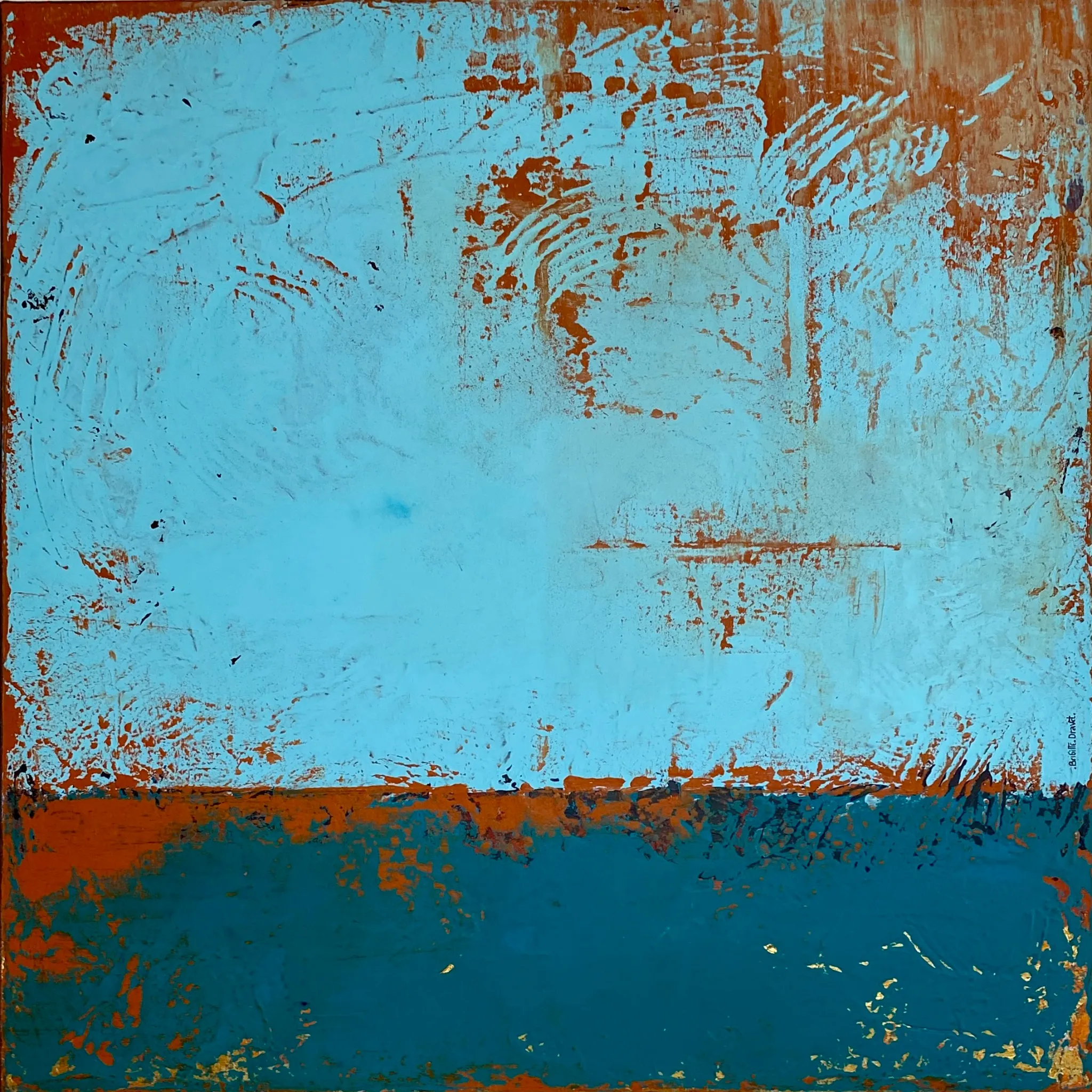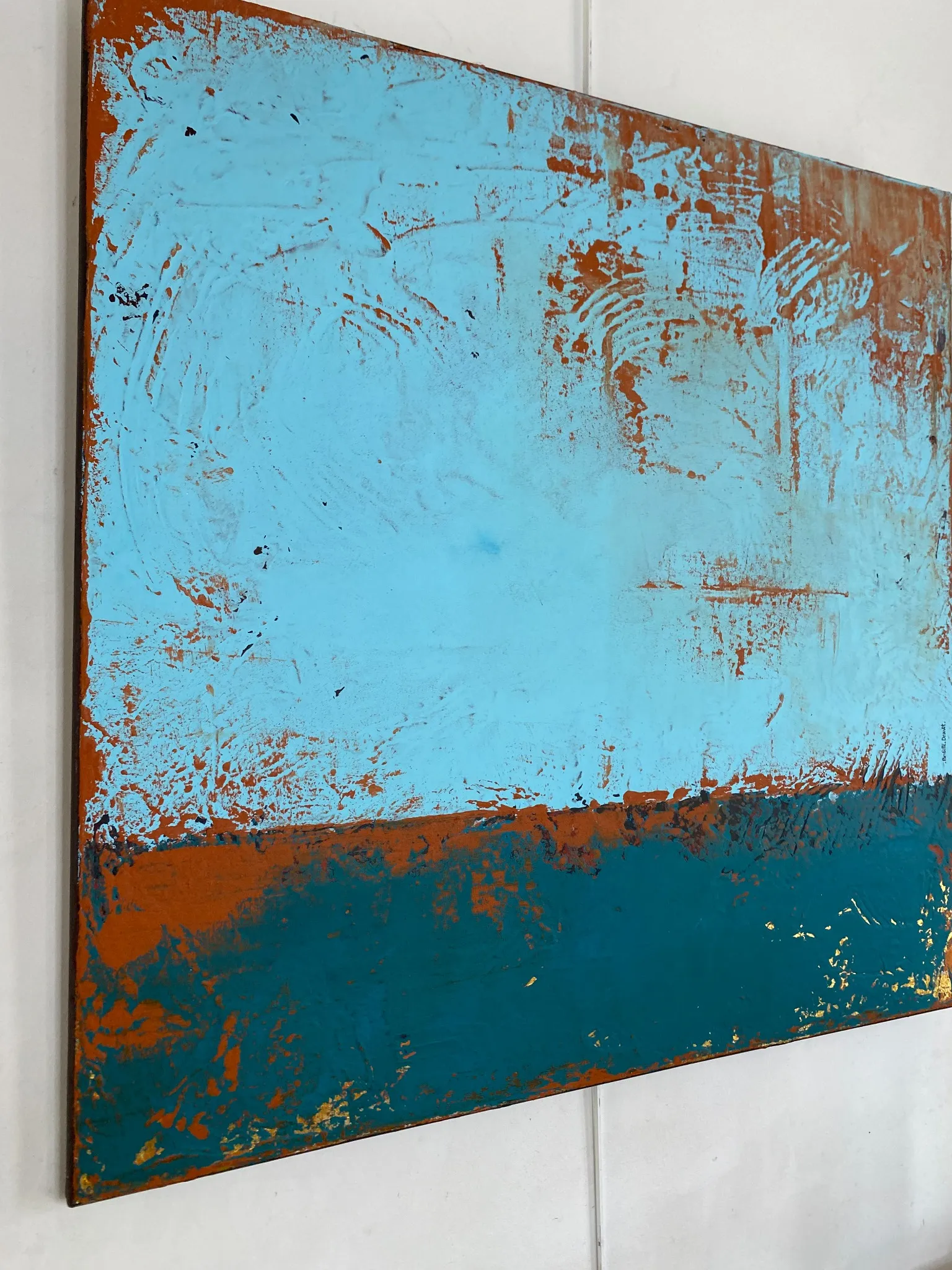 Layers of luminous blue and rust-orange create an expansive field of sky and light, evoking emergence, spontaneity, and space.