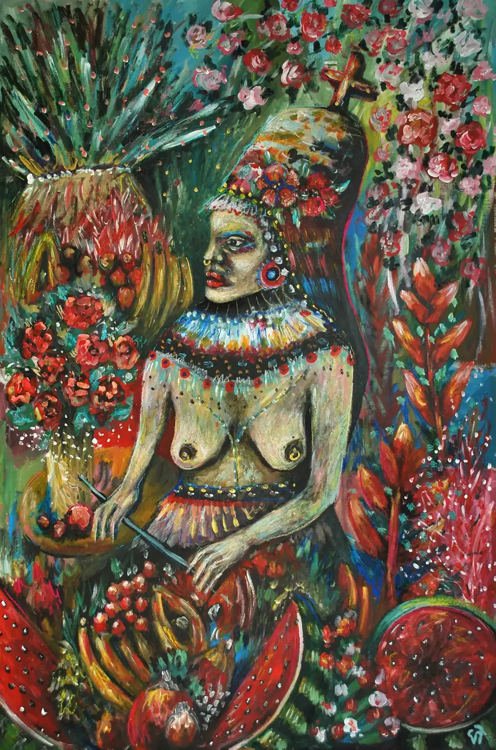 Jaramillo’s use of bold, warm hues like reds, greens, and yellows, interspersed with delicate accents of blue and pink, enhances the painting's dynamic and passionate mood. The brushstrokes are both deliberate and expressive, capturing the vibrant essence of the Palenquera heritage while simultaneously conveying a sense of mysticism and exotic allure. The combination of acrylic medium and cardboard surface adds a raw, textured quality to the artwork, further emphasizing its organic, untamed spirit.This painting's surrealist elements invite the viewer to delve deeper, exploring the layered meanings and cultural references woven into its composition. “Palenquera I” is not just a visual feast; it is a cultural statement that celebrates the beauty and strength of the feminine spirit. This piece would be an ideal addition to a living room, art gallery, or cultural space, where its vibrant energy can inspire and captivate viewers.Valeria Jaramillo, born in Cali, Colombia, continues to push the boundaries of figurative surrealism with her eclectic and anachronistic style. Her works explore the Aristotelian dilemma of human passions through various media, and “Palenquera I” is a testament to her skill in blending vivid imagery with profound cultural narratives. Whether you are an art collector or simply an admirer of expressive, vibrant art, this painting is sure to leave a lasting impression.
