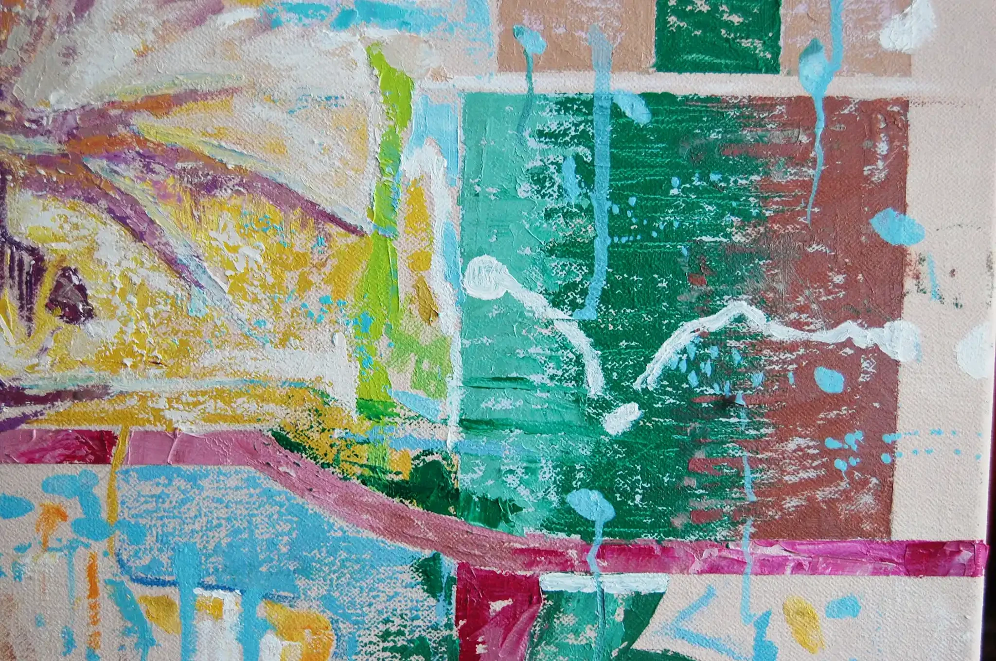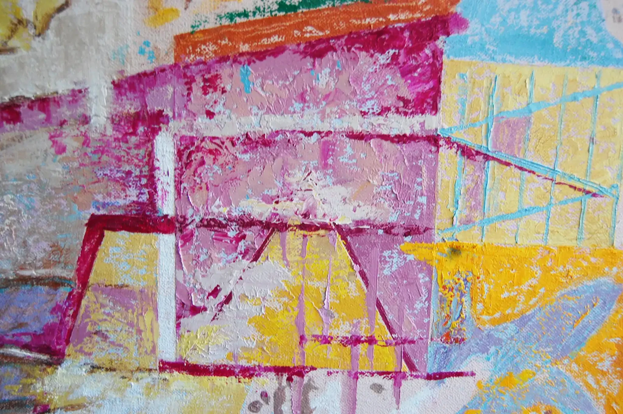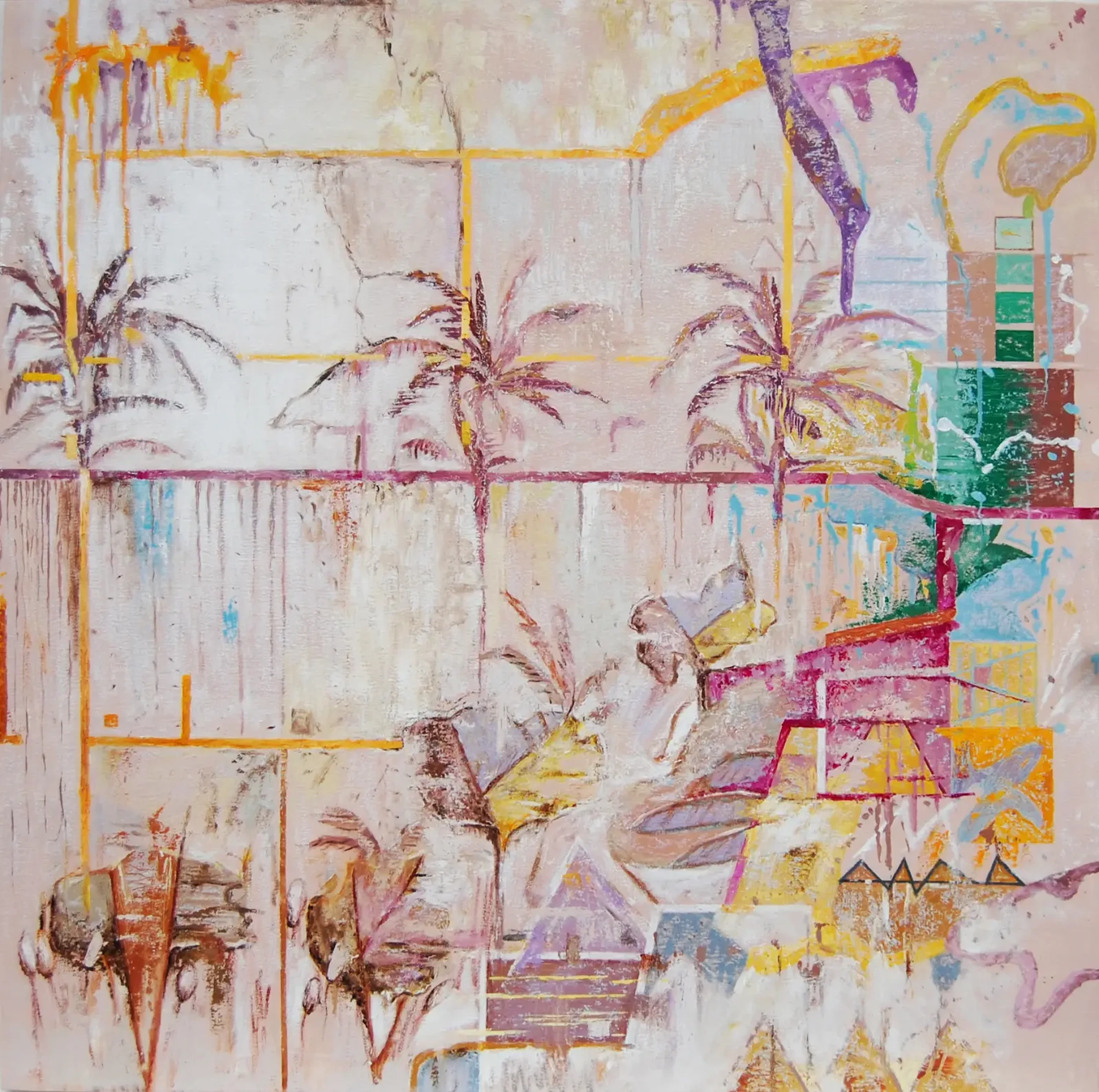 The painting’s central elements, including palm tree motifs and geometric layering, evoke the essence of a tropical paradise. Soft pinks, greens, and yellows blend harmoniously, punctuated by subtle contrasts of deeper tones, creating a lively yet calming atmosphere. The intricate textures and layering techniques enhance the sense of depth, reflecting Cal’s mastery of modern abstraction.