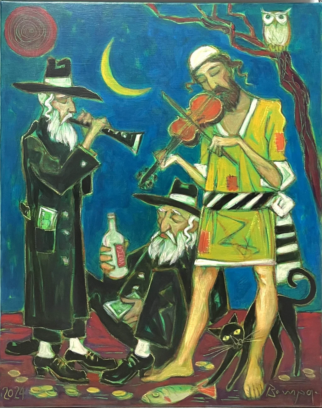 The scene features a violinist and a clarinetist, accompanied by an elder enjoying the moment, a black cat, an owl, and symbolic elements like golden coins and fish. The deep blues, warm golds, and earthy tones create a nostalgic and festive atmosphere, making this piece a striking addition to cultural spaces, galleries, or artistic collections. Ioan Bompa’s expressive style and emotional depth bring this rich, celebratory composition to life.