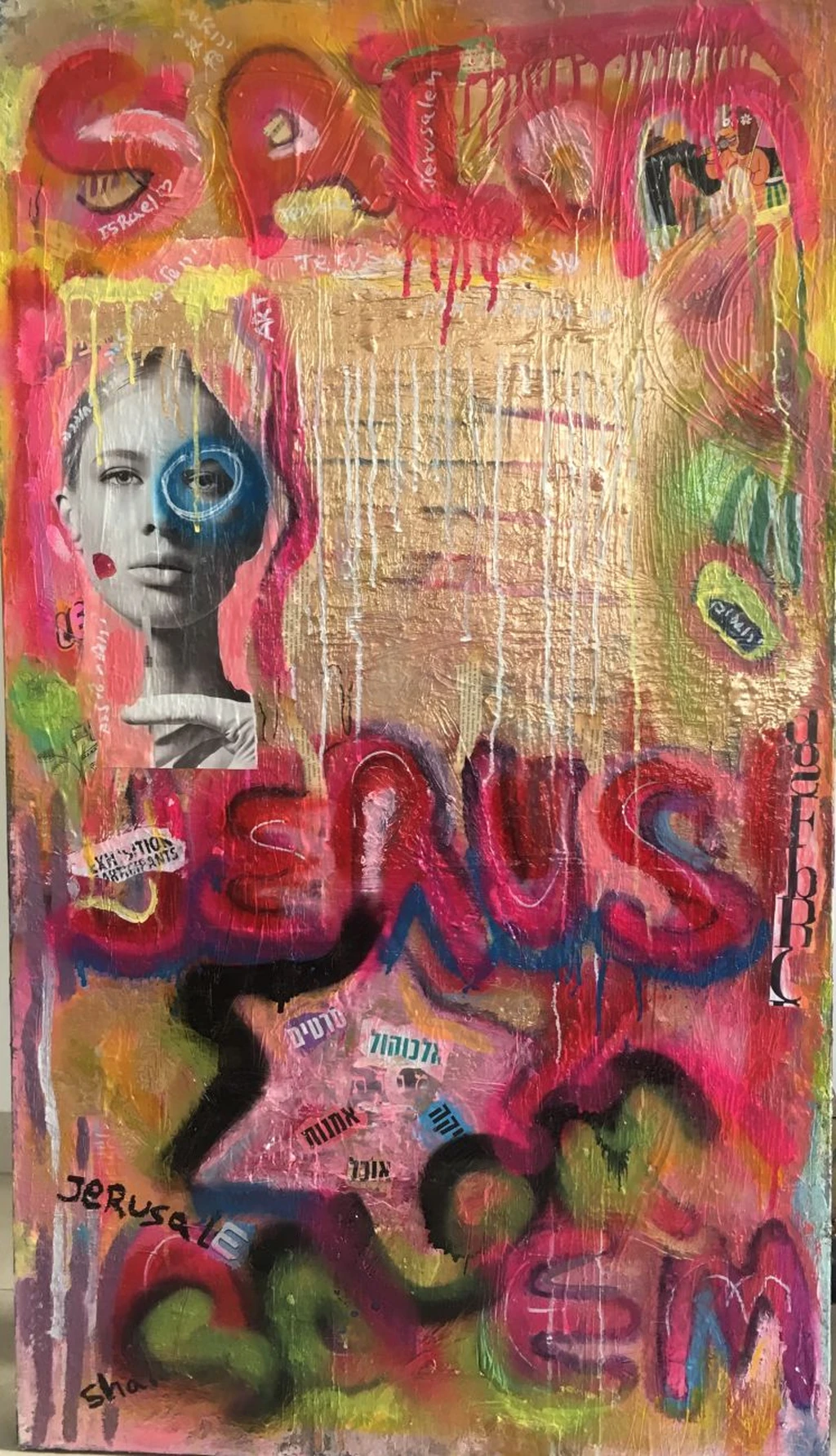 At the heart of the painting, a striking black-and-white portrait of a woman emerges from the colorful background, symbolizing the human connection to Jerusalem. Graffiti-style lettering, dripping paint, and torn paper elements contribute to the urban aesthetic, evoking the vibrancy of street art and contemporary social movements. The bold, rebellious strokes, combined with layered textures, give the artwork an electrifying presence, making it impossible to ignore.