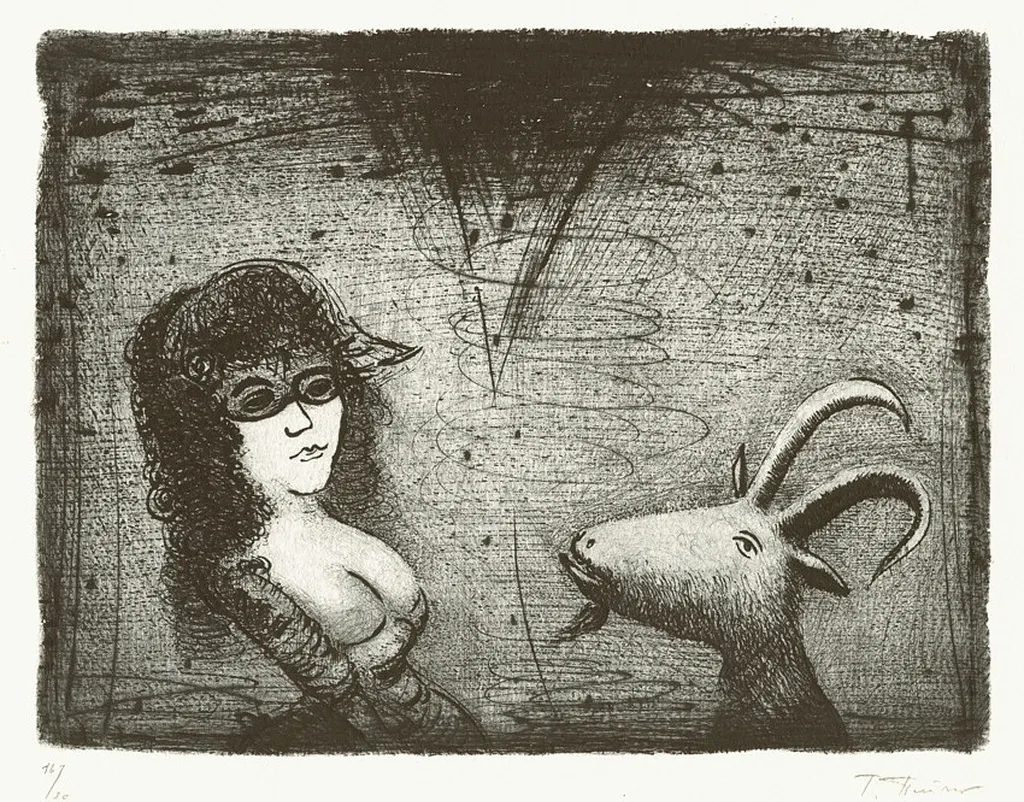 This artwork is a captivating exploration of surrealism and fantasy, featuring a masked woman alongside a curious goat. Rendered in a striking monochromatic palette, the etching draws viewers into a dreamlike atmosphere infused with intrigue and mystery.