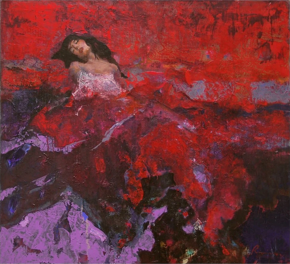 The dominant red hues create a feeling of passion and energy, while the contrasting purples and blacks add depth and mystery. The subtle white highlights provide balance, guiding the viewer’s eye through the composition. Reznichenko’s expressive brushstrokes and layered textures bring movement to the painting, making it feel alive and almost in motion.