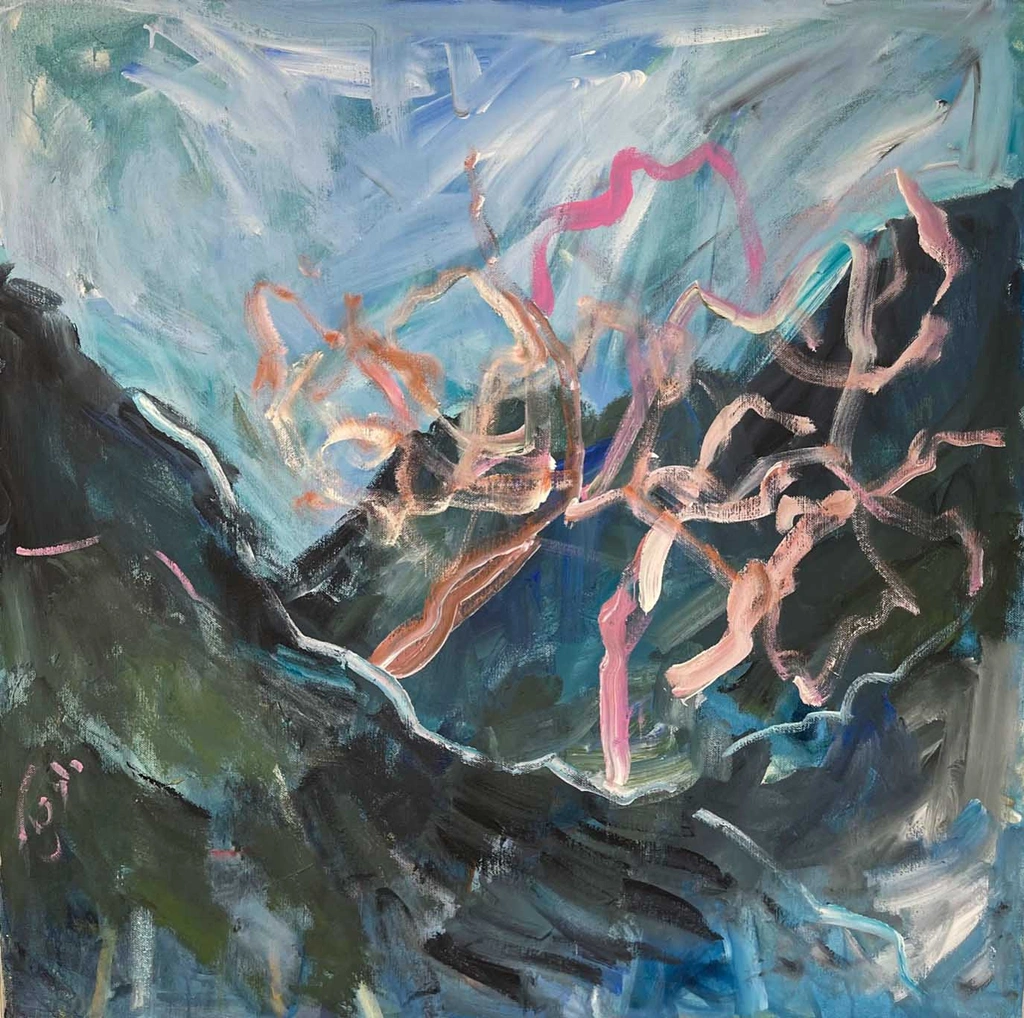 Measuring 100 cm x 100 cm, this dynamic artwork masterfully combines abstract expressionism with impressionist influences. The cool tones of blues and greens form a serene backdrop, accented by vibrant pink and peach highlights that evoke the graceful sway of branches in motion.