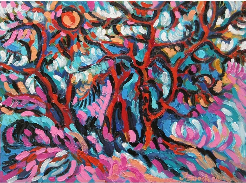 Bright and colorful, this painting explores nature's beauty through dynamic strokes and bold colors, drawing viewers into a vibrant and joyful atmosphere. Suitable for living rooms or galleries.