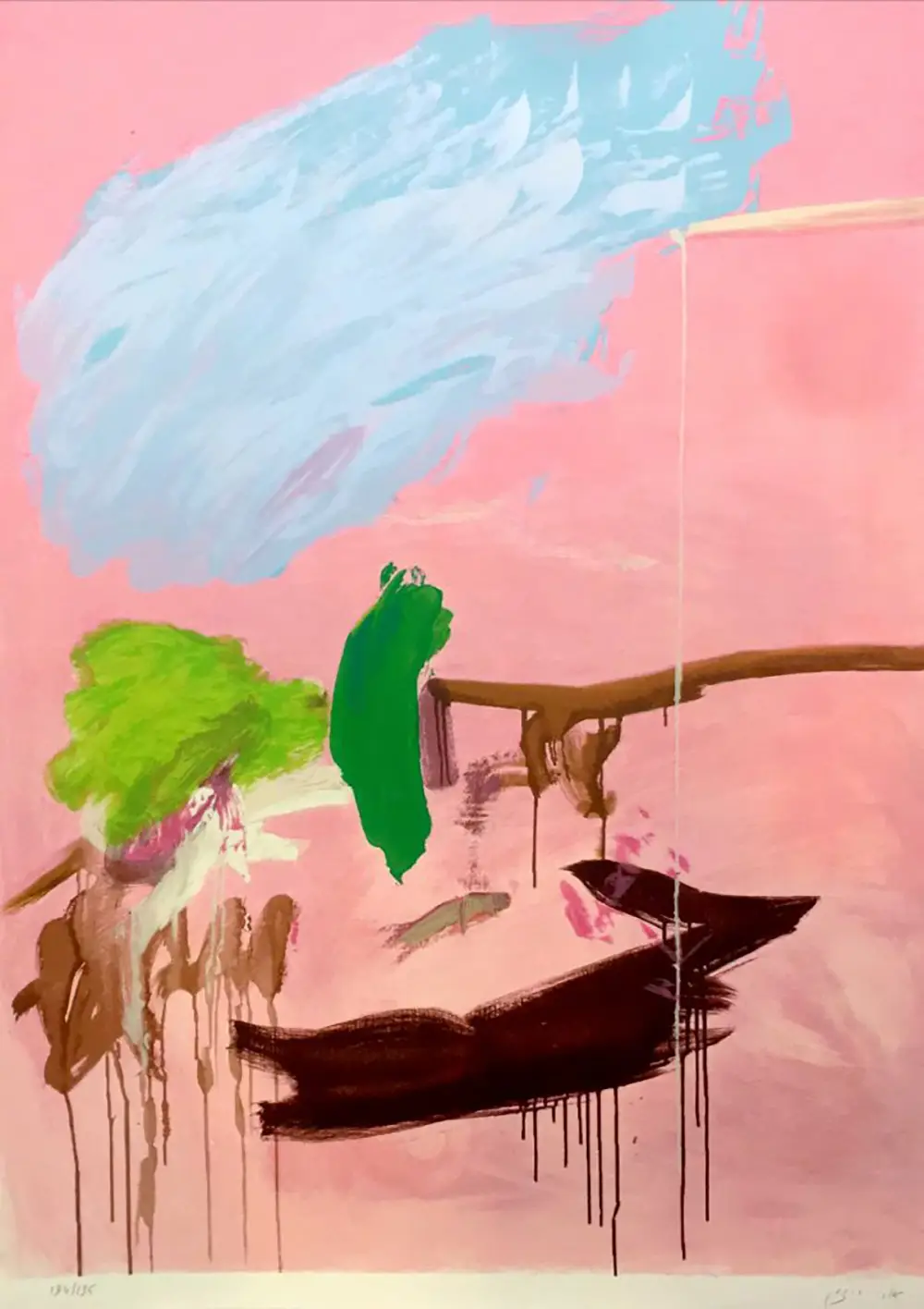 "Pink Sky," created by Uri Reisman, is an abstract landscape that captures the viewer's attention with its vibrant and unconventional color palette. Dominated by a bright pink sky, the painting features expressive brushstrokes of blue, green, and brown, creating a sense of movement and fluidity. The green and brown forms suggest elements of nature, such as trees and land, while the large blue brushstroke resembles a cloud, adding depth and contrast to the composition. The drips and splashes of paint add to the modern, dynamic feel of the piece. The abstract nature of the painting allows for various interpretations, evoking feelings of freedom and creativity. This artwork would be a striking addition to contemporary spaces such as living rooms, offices, or art studios.