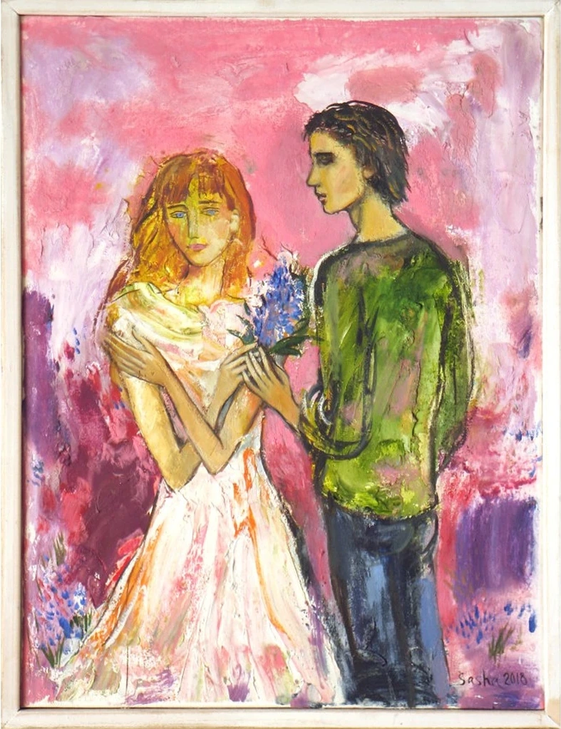 Bakhina’s use of bold, expressive brushstrokes and a rich palette of pinks, blues, and greens creates a poetic and emotional atmosphere. The contrast between the vivid background and the figures’ delicate expressions enhances the painting’s depth, evoking both tenderness and uncertainty. Whether displayed in a bedroom, romantic space, or art gallery, "Pink Sunrise" is a powerful tribute to love, emotions, and the beauty of human connection.