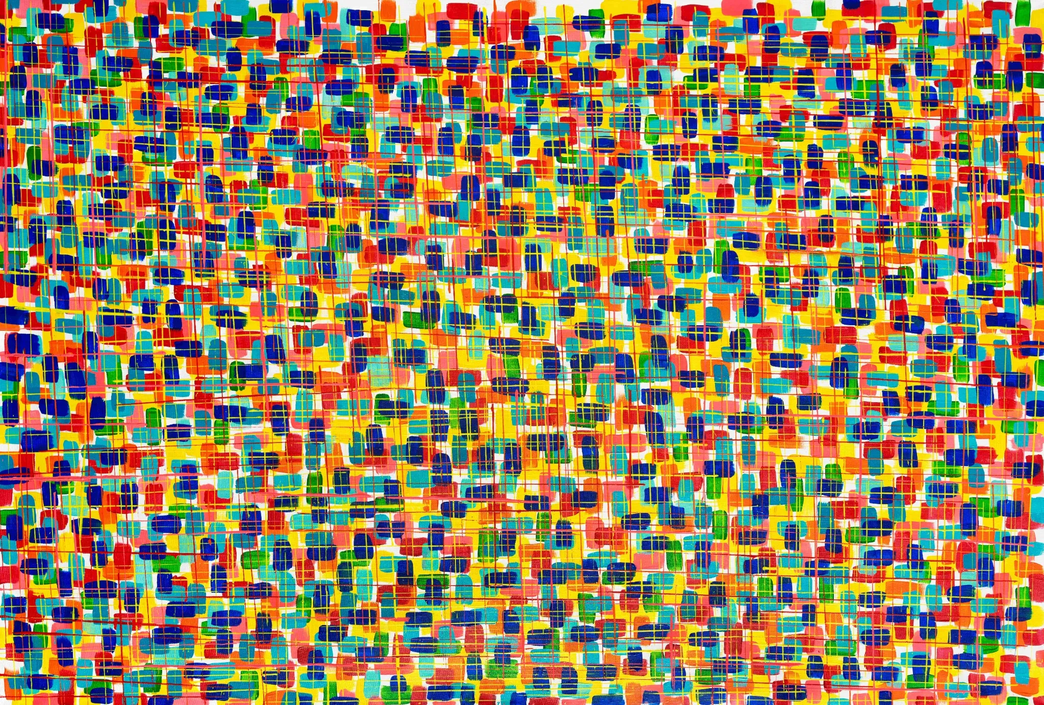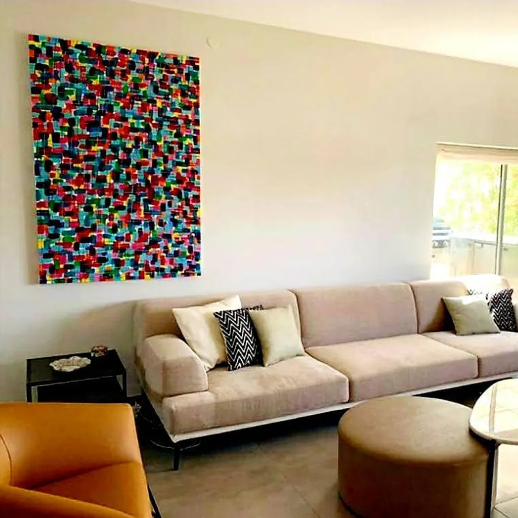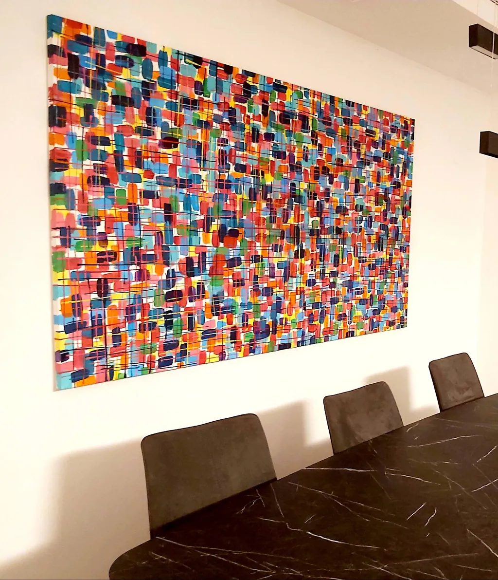 This large 200 x 100 cm acrylic on canvas artwork radiates optimism reflecting a harmonious blend of geometric elements and lively hues. Its pixel like textures are layered with blues yellows reds and greens symbolizing the beauty of diversity and human connection.