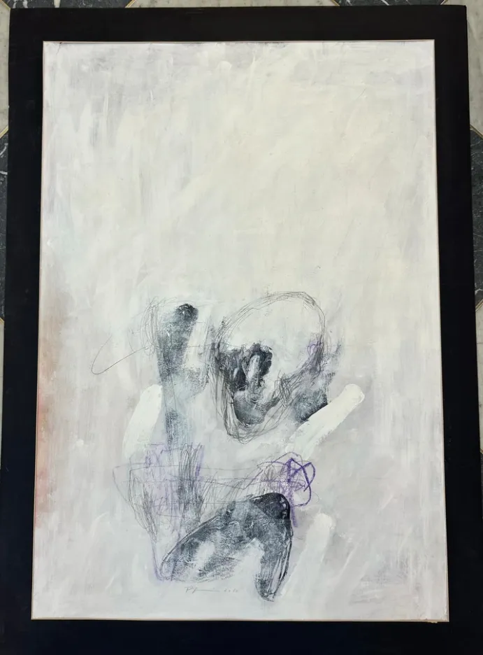 Executed with mixed techniques on paper, the figure appears like a fleeting memory—a ghostlike suggestion of the body rendered in charcoal black, soft violet lines, and enveloped by a sea of muted greys and white.