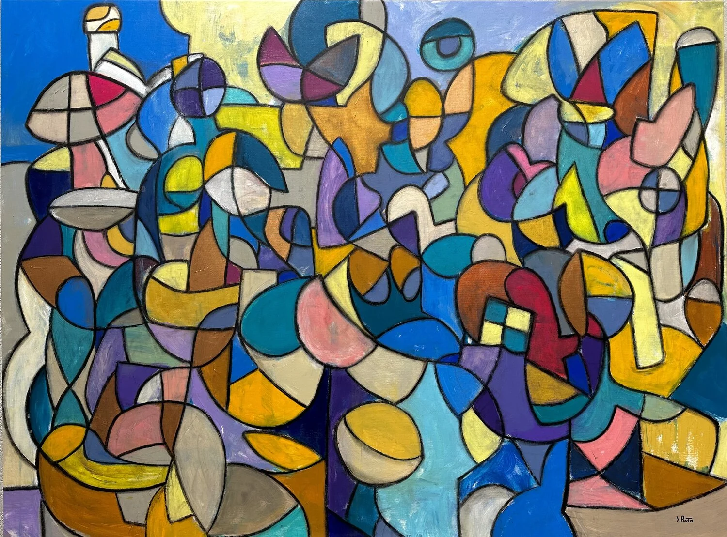 The intricate geometric patterns in "Polynesia" evoke a sense of fluidity and motion, inviting viewers to immerse themselves in its chromatic energy. A rich palette of blues, yellows, and warm contrasts brings life to the piece, reflecting the artist's signature style of dynamic color composition. The overlapping shapes form a mosaic-like abstraction that communicates joy, freedom, and inspiration.