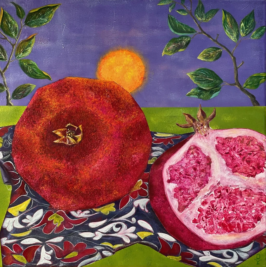Immerse yourself in the vibrant beauty of Pomegranates a 60x60 cm acrylic still life painting by Olga Yakunina
