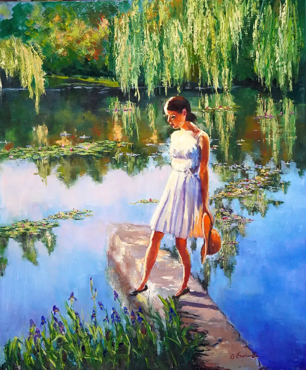 "Pond" by Olga Egorov is a masterful depiction of quietude and contemplation. The young woman, gazing upon the still waters bordered by willows and blooming lilies, is portrayed in a moment of peaceful solitude. The dappled light and reflections on the water create a sense of depth and fluidity, while the surrounding greens and blues evoke the freshness of nature. Egorov's brushwork expertly conveys the textures of the landscape, inviting the viewer into a serene, almost ethereal space. This painting would be a tranquil addition to a living space, a spa, or anywhere one seeks a calming influence.