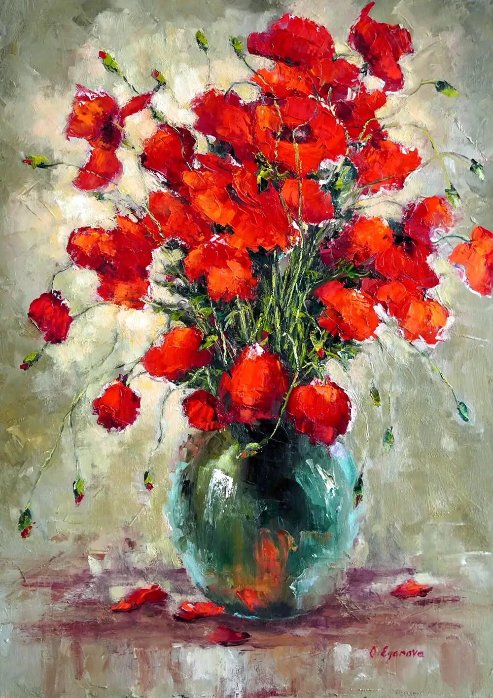 This painting is a captivating celebration of color and life. Egorov bold red poppies burst from the canvas, their petals appearing almost in motion against the serene backdrop. The juxtaposition of the vivid flowers with the tranquil turquoise vase creates a dynamic visual harmony. The artist's expressive brushstrokes and the tactile quality of the oil paint add depth and realism to the work, making it an ideal piece to bring energy and warmth to any space.