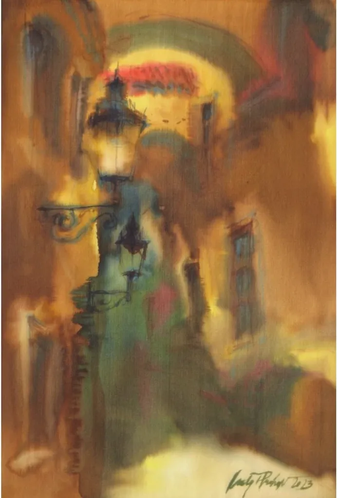 Painted with the delicate batik on silk technique, this impressionist cityscape glows with warm ochres, golds, and deep browns, while subtle greens and muted blues provide an intriguing contrast. The soft blending of colors creates a poetic, almost ethereal atmosphere, where light and shadow dance across the scene.