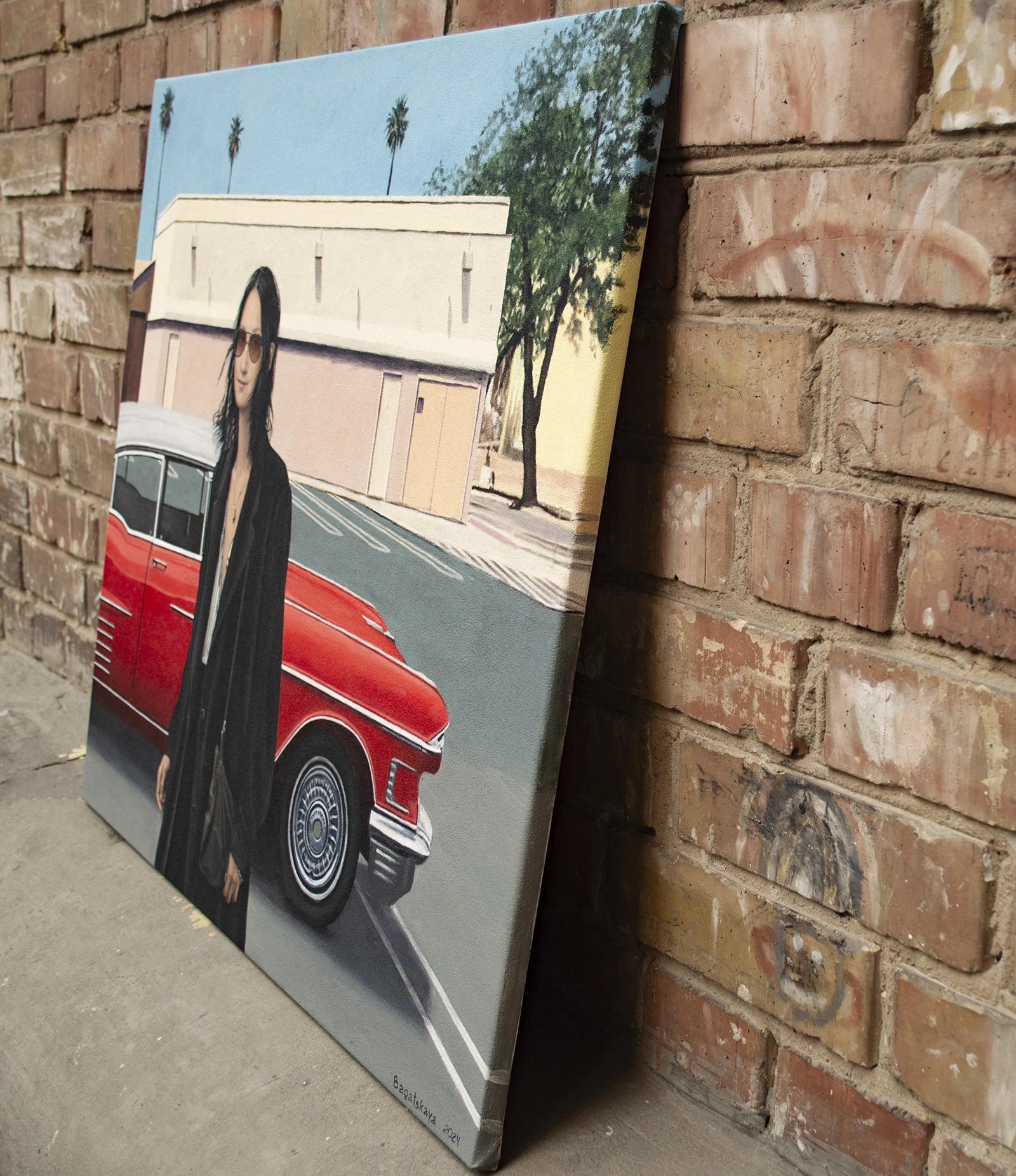 A striking realist portrait, Red Auto pairs vintage automotive style with urban solitude, capturing presence and independence in one reflective moment.