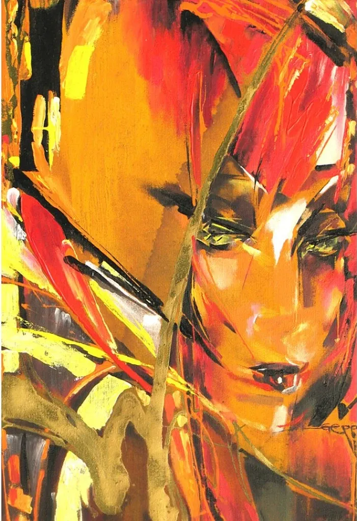 Nady Gepp, an internationally celebrated artist known for her fusion of figurative and abstract expressionism, masterfully captures the essence of raw emotion and feminine power in "Red-Haired Beauty".