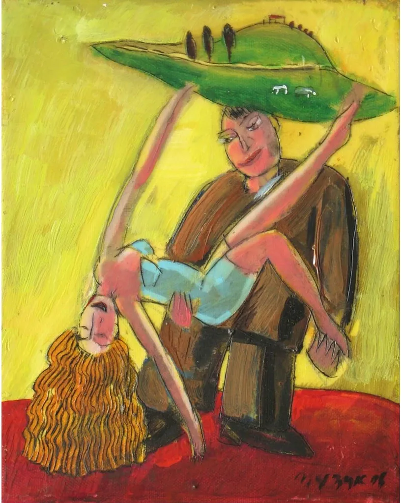 The bold yellows, reds, and deep greens create a dramatic, dreamlike atmosphere filled with whimsy and theatrical energy. This naïve art piece evokes passion, mystery, and playfulness, making it a perfect addition to a living room, lounge, art gallery, or creative studio. "Red-Haired Dream" invites viewers to step into a surreal world where dance and fantasy intertwine effortlessly.